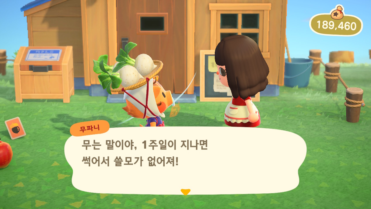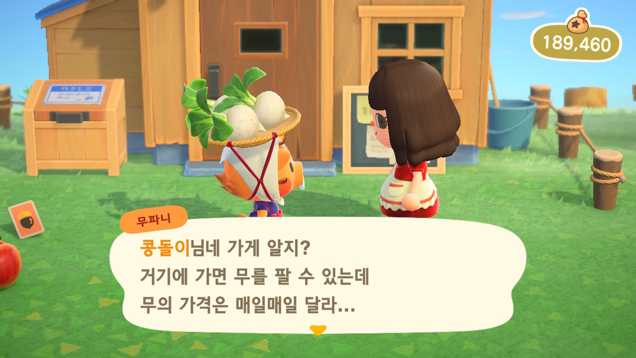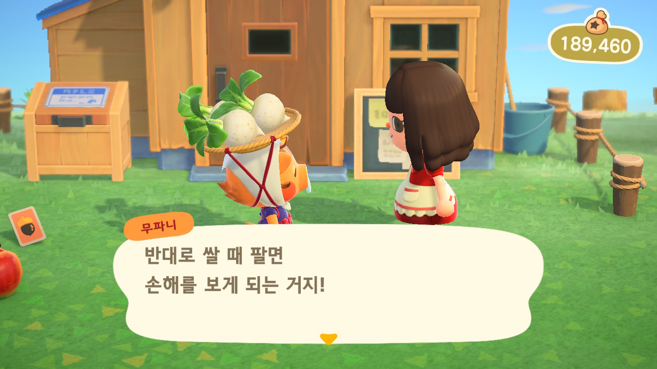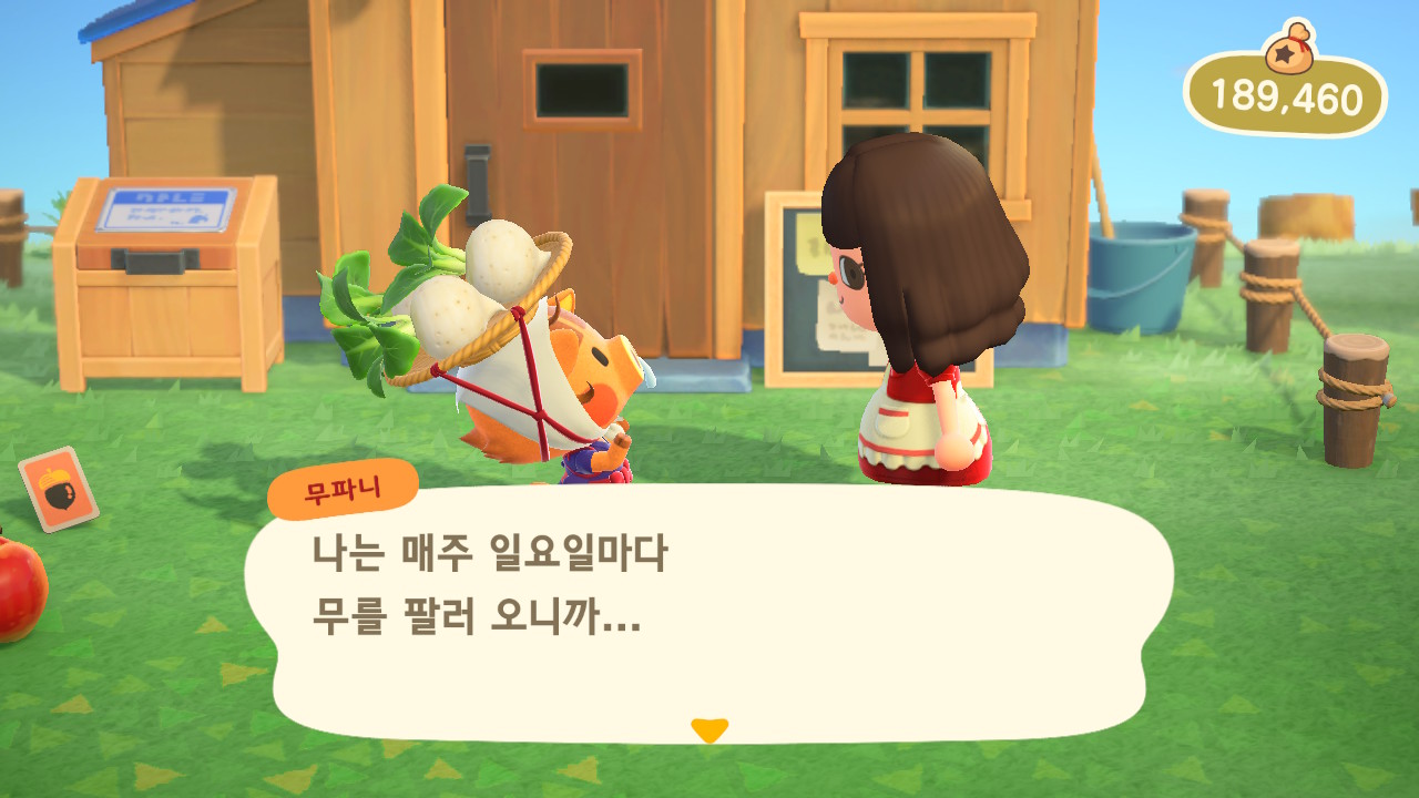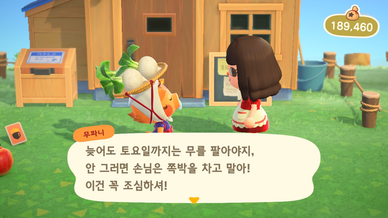 그리고 너굴 상점 오픈 후 첫 일요일 오전!! 드디어 무파니를 만났습니다. 코흘리개 무파니가 무를 어떻게 사고 파는지 자세히 설명해줍니다. 일요일에는 무를 팔 수 없으니 토요일 까지는 팔아야 하고 팔지 않은 무는 썩어버려요. 무 시세 차익으로 벨을 많이 벌 수 있기 때문에 무트코인이라고도 불립니다. 모두 무트코인 투자하셔서 벨 많이 모으세요~