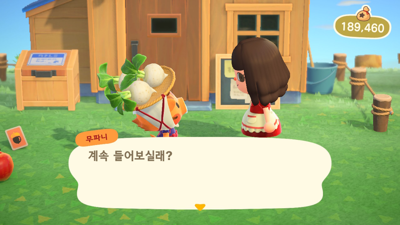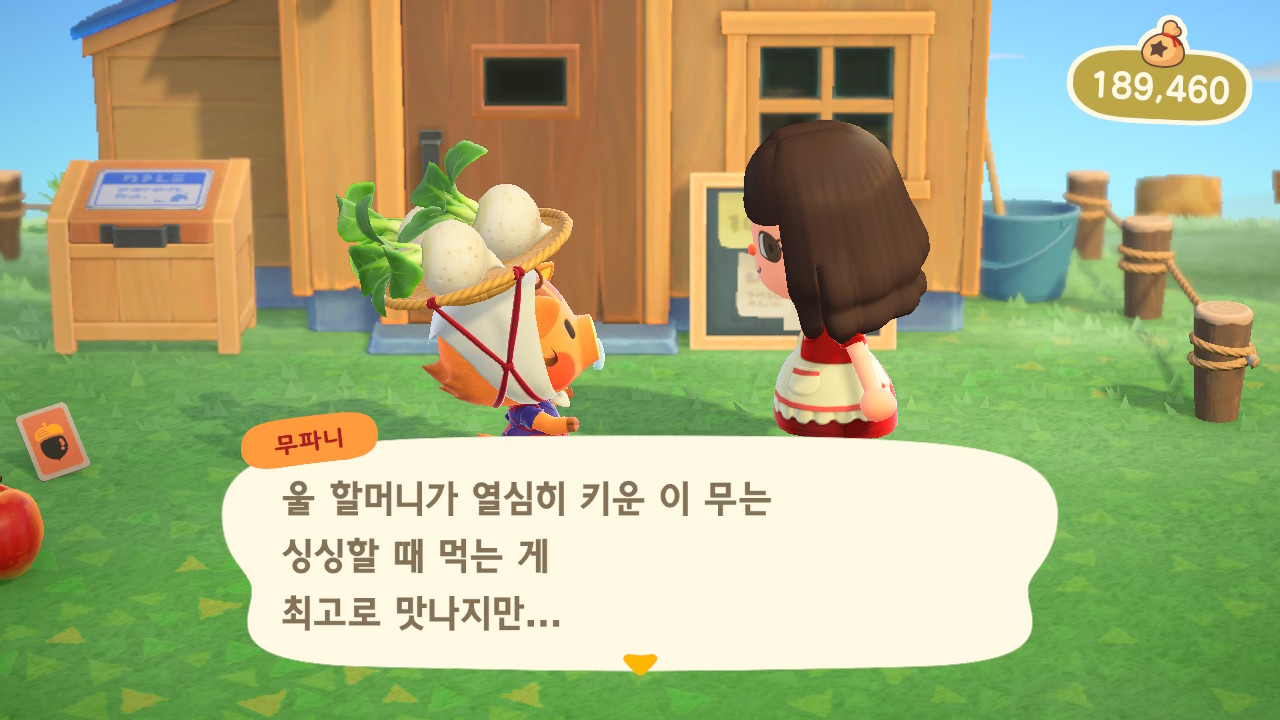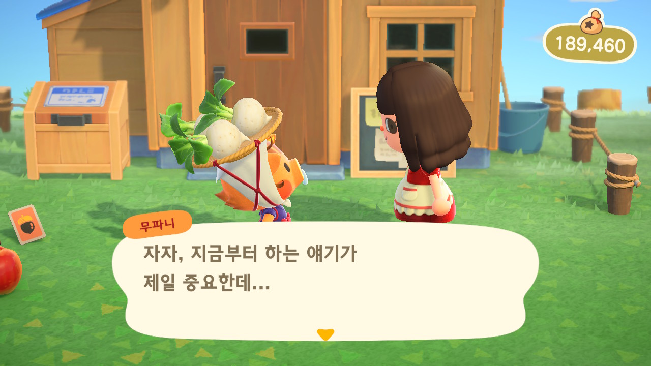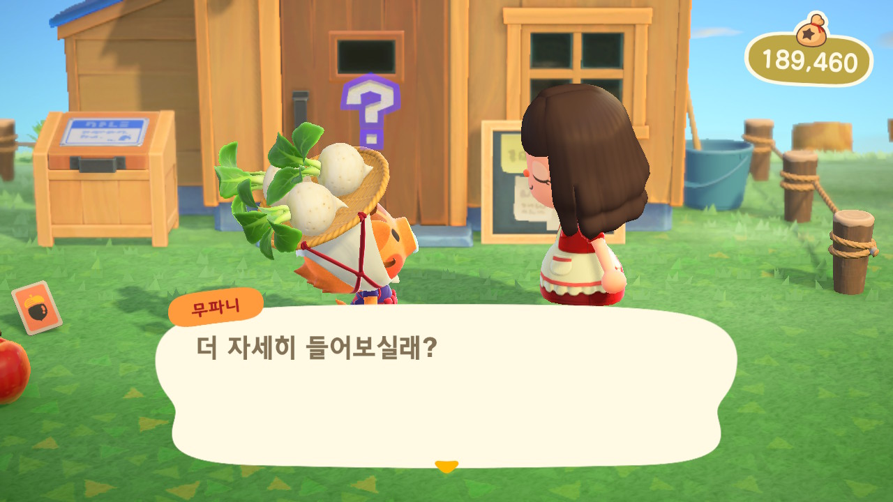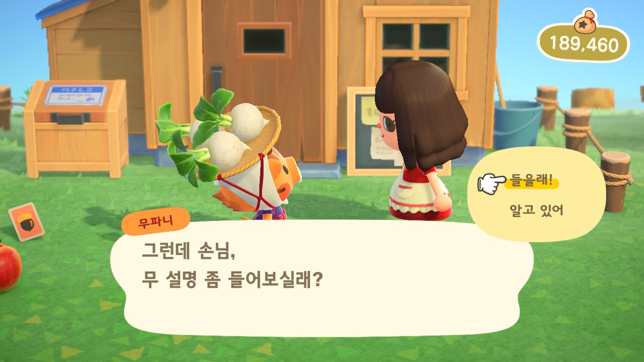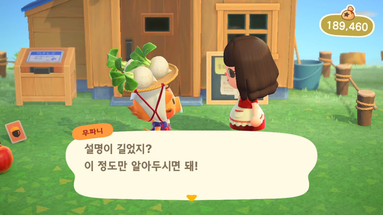 그리고 너굴 상점 오픈 후 첫 일요일 오전!! 드디어 무파니를 만났습니다. 코흘리개 무파니가 무를 어떻게 사고 파는지 자세히 설명해줍니다. 일요일에는 무를 팔 수 없으니 토요일 까지는 팔아야 하고 팔지 않은 무는 썩어버려요. 무 시세 차익으로 벨을 많이 벌 수 있기 때문에 무트코인이라고도 불립니다. 모두 무트코인 투자하셔서 벨 많이 모으세요~