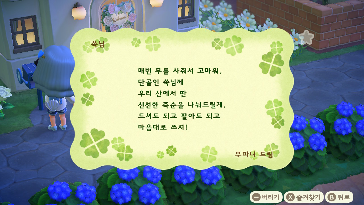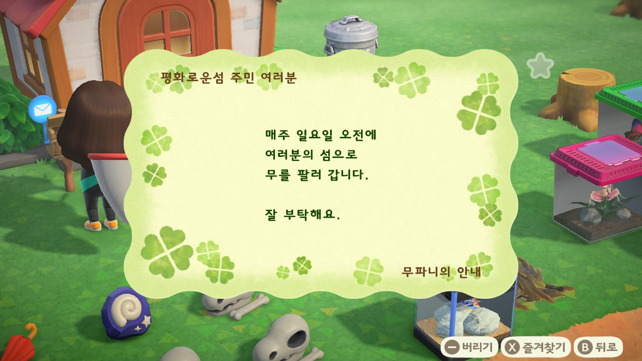 너굴 상점을 오픈하면 무파니에게 편지가 옵니다.
