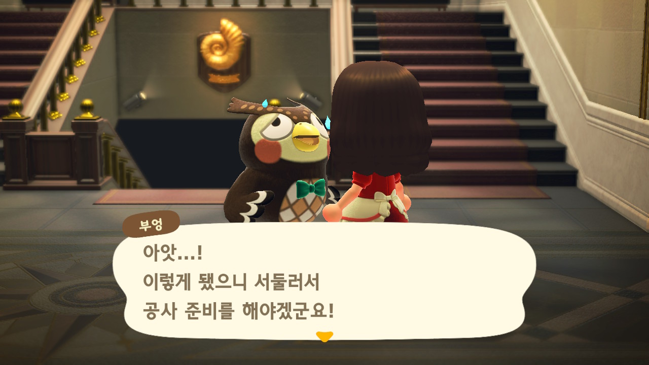 6일차에는 다섯번째 주민 마르카가 이사왔어요. 그리고 어제 부엉이가 미술품을 찾으면 알려달라고 했는데 오늘 바로 여욱이가 방문을 했네요. 그리고 다음날 안내소 확장을 하기 위해 하루 휴업한다는 안내가 있었습니다.