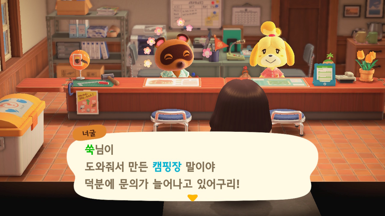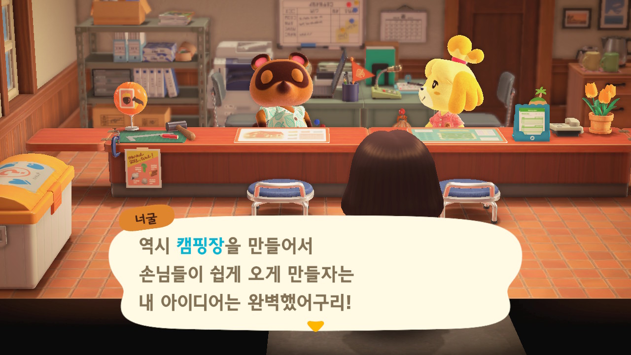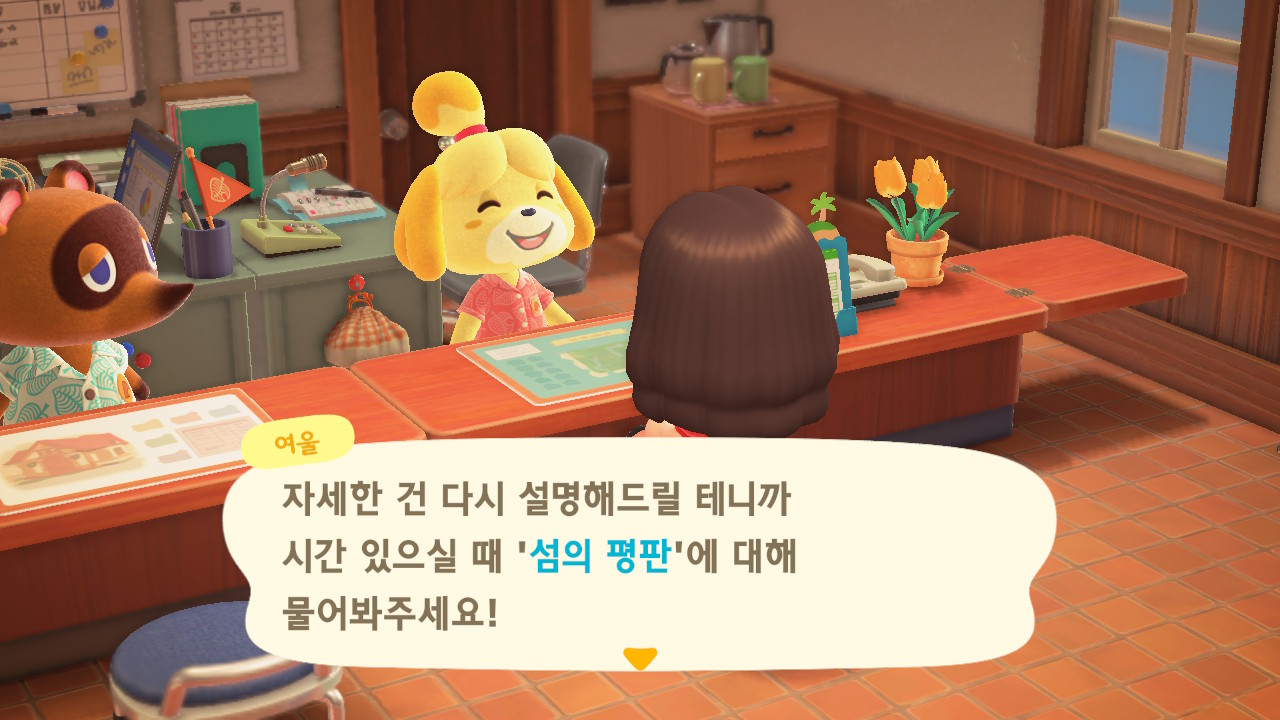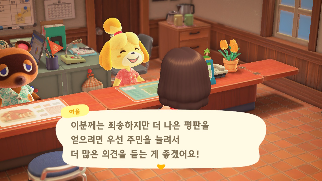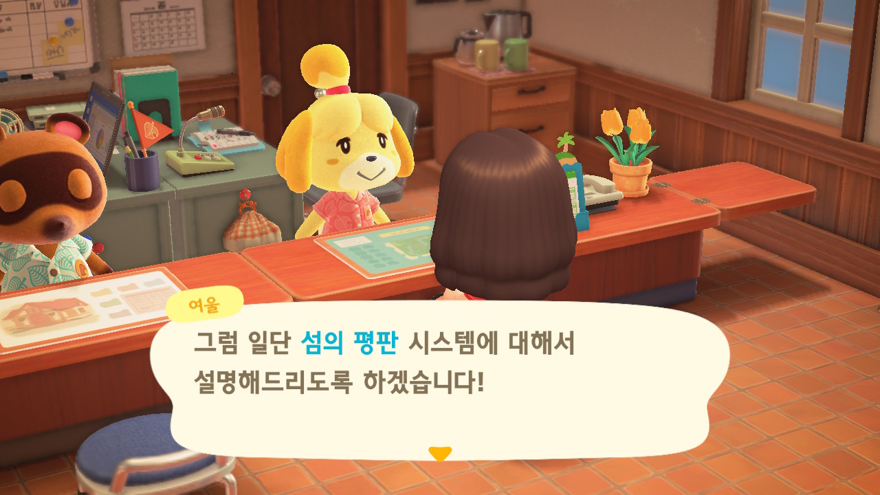 캠핑장 손님이 이주한 이후에 너굴이와 여울이가 섬의 평판에 대해 설명해줍니다. 현재 섬의 평판은 별 1개네요. 제일 먼저 해야 할 일은 주민 수 늘리기입니다. 현재까지 초기 주민 2명, 추가로 집을 지어서 이주한 주민 3명, 캠핑장 이주자 1명 총 6명인 상태입니다. 너굴이가 아미보 카드를 이용해 캠핑장에 손님을 초대할 수 있다고 알려주네요. 아미보 카드가 없어도 가끔 캠핑장에 손님이 찾아오니 걱정하지 않아도 돼요. 그리고 마일 섬에서도 주민을 데려올 수 있어요.