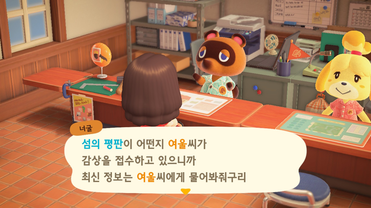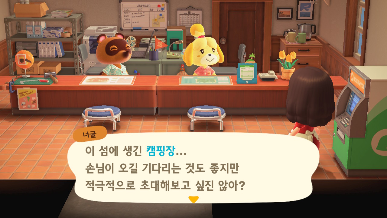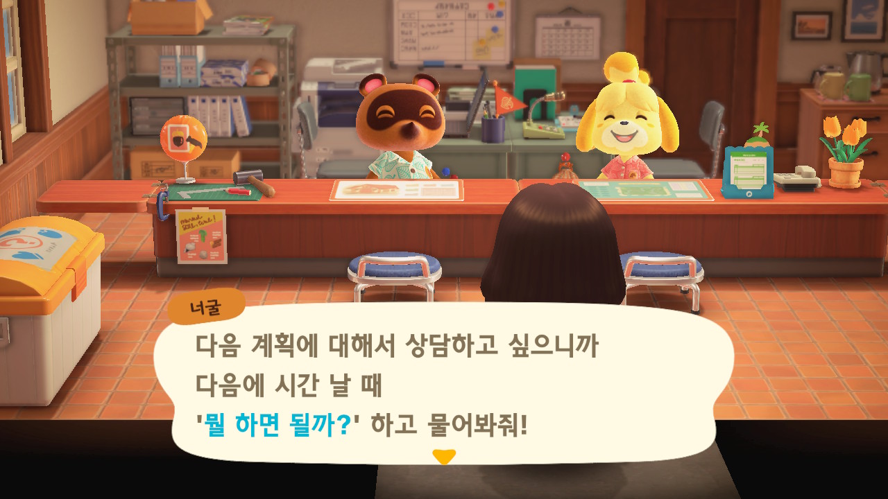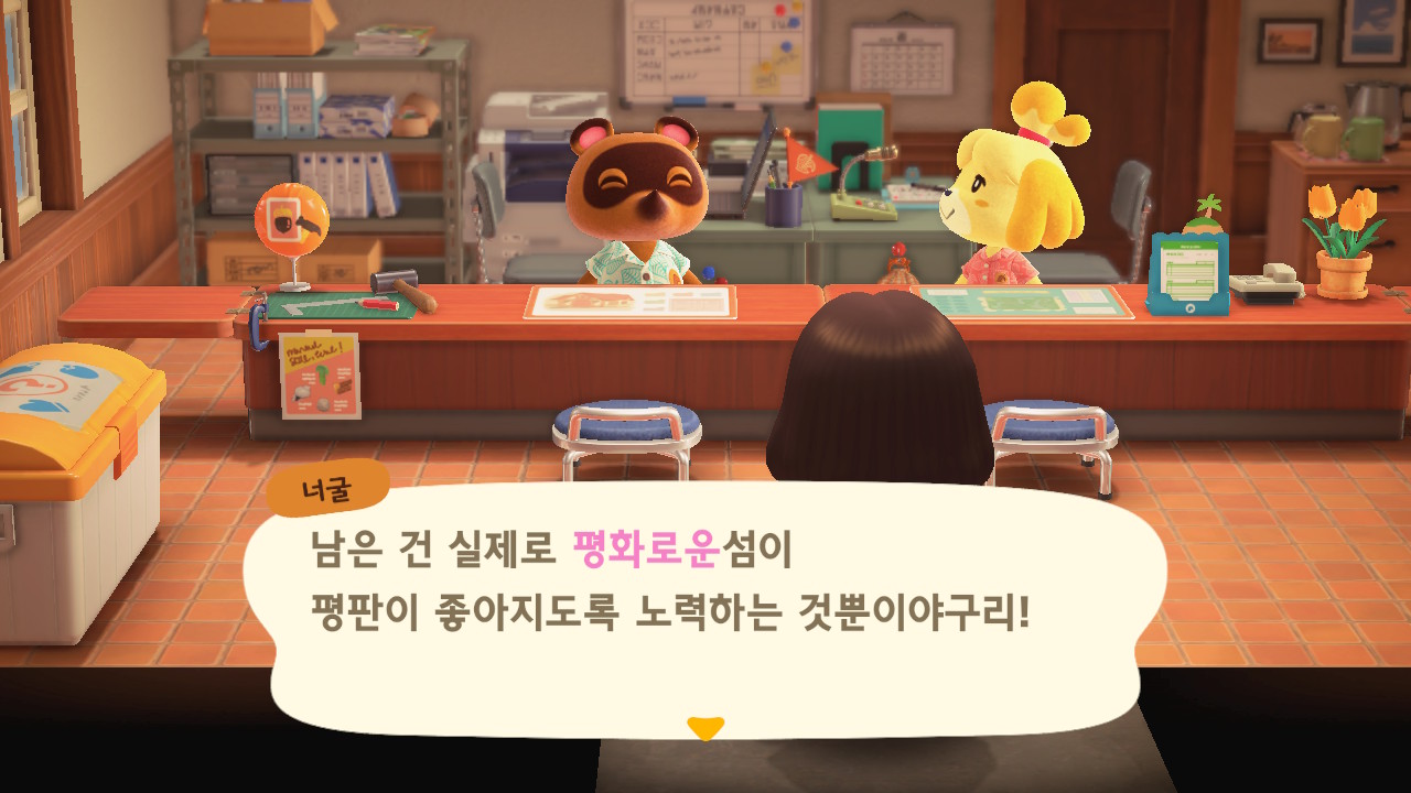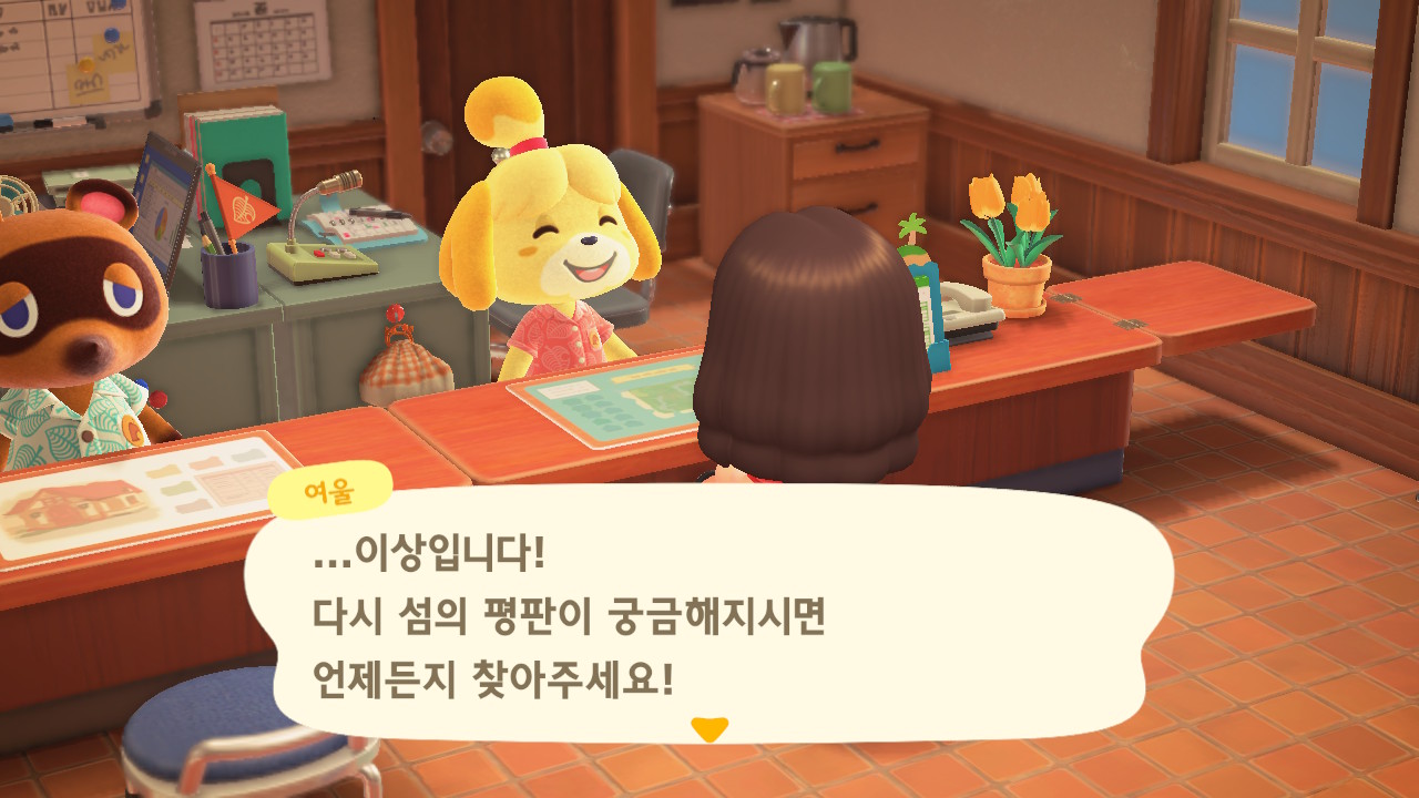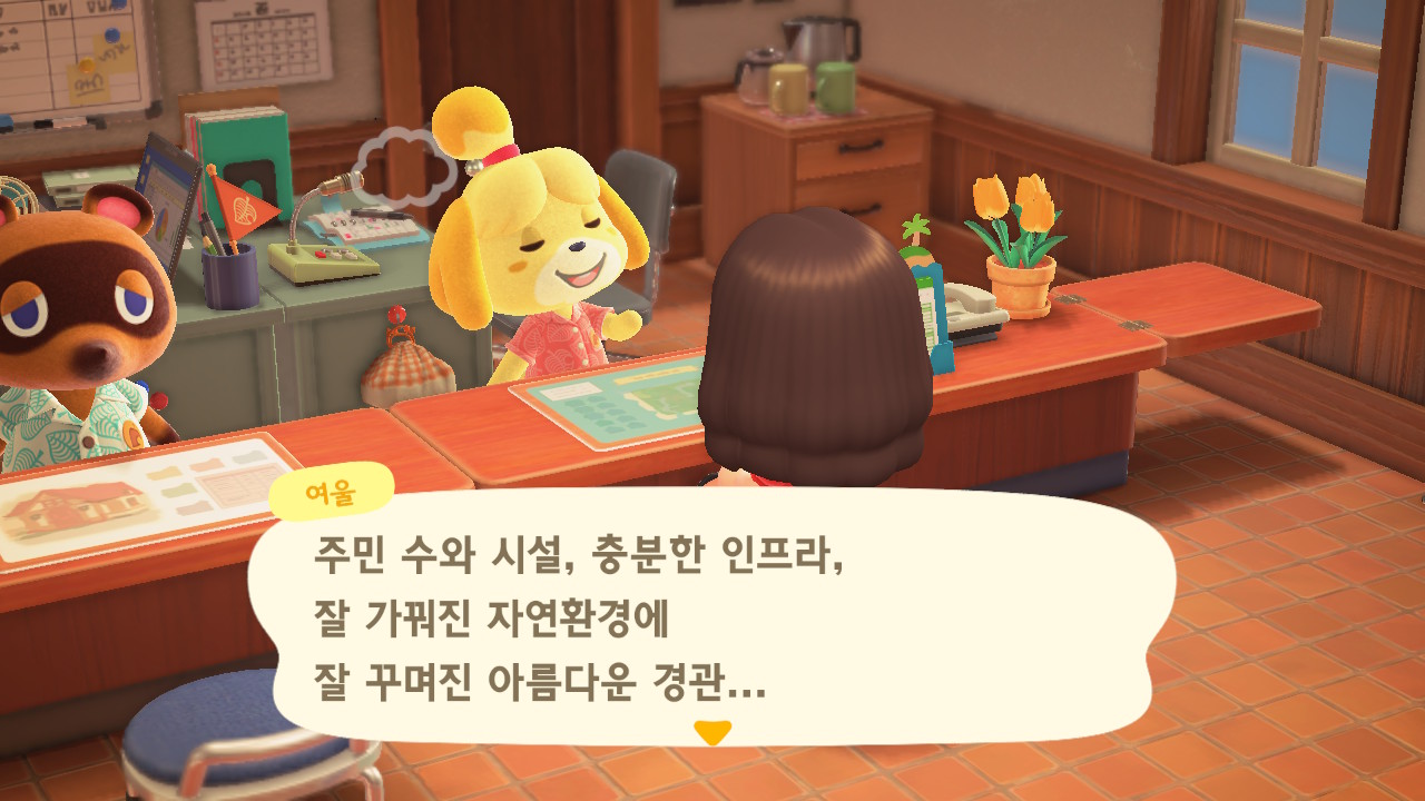 캠핑장 손님이 이주한 이후에 너굴이와 여울이가 섬의 평판에 대해 설명해줍니다. 현재 섬의 평판은 별 1개네요. 제일 먼저 해야 할 일은 주민 수 늘리기입니다. 현재까지 초기 주민 2명, 추가로 집을 지어서 이주한 주민 3명, 캠핑장 이주자 1명 총 6명인 상태입니다. 너굴이가 아미보 카드를 이용해 캠핑장에 손님을 초대할 수 있다고 알려주네요. 아미보 카드가 없어도 가끔 캠핑장에 손님이 찾아오니 걱정하지 않아도 돼요. 그리고 마일 섬에서도 주민을 데려올 수 있어요.
