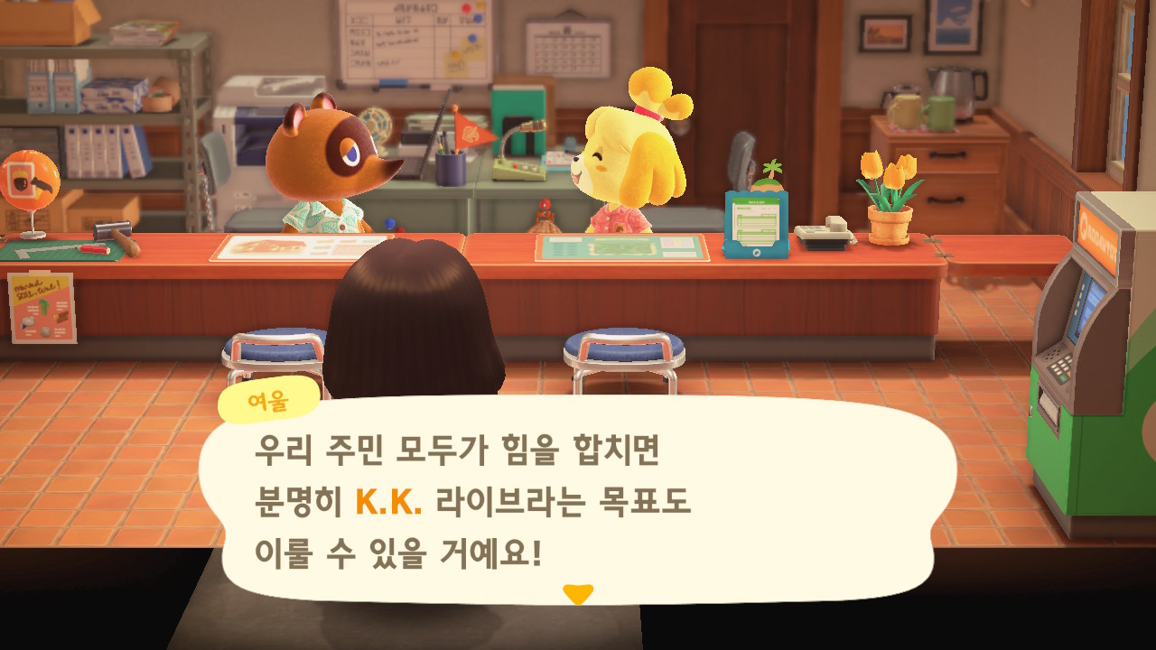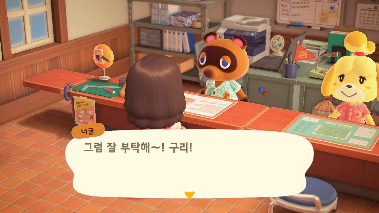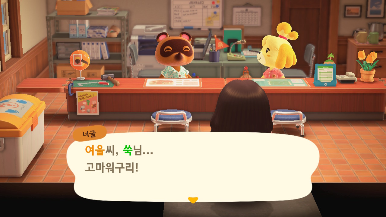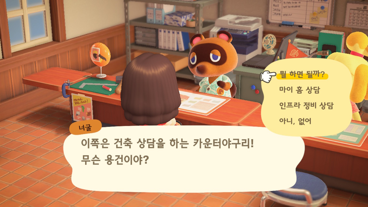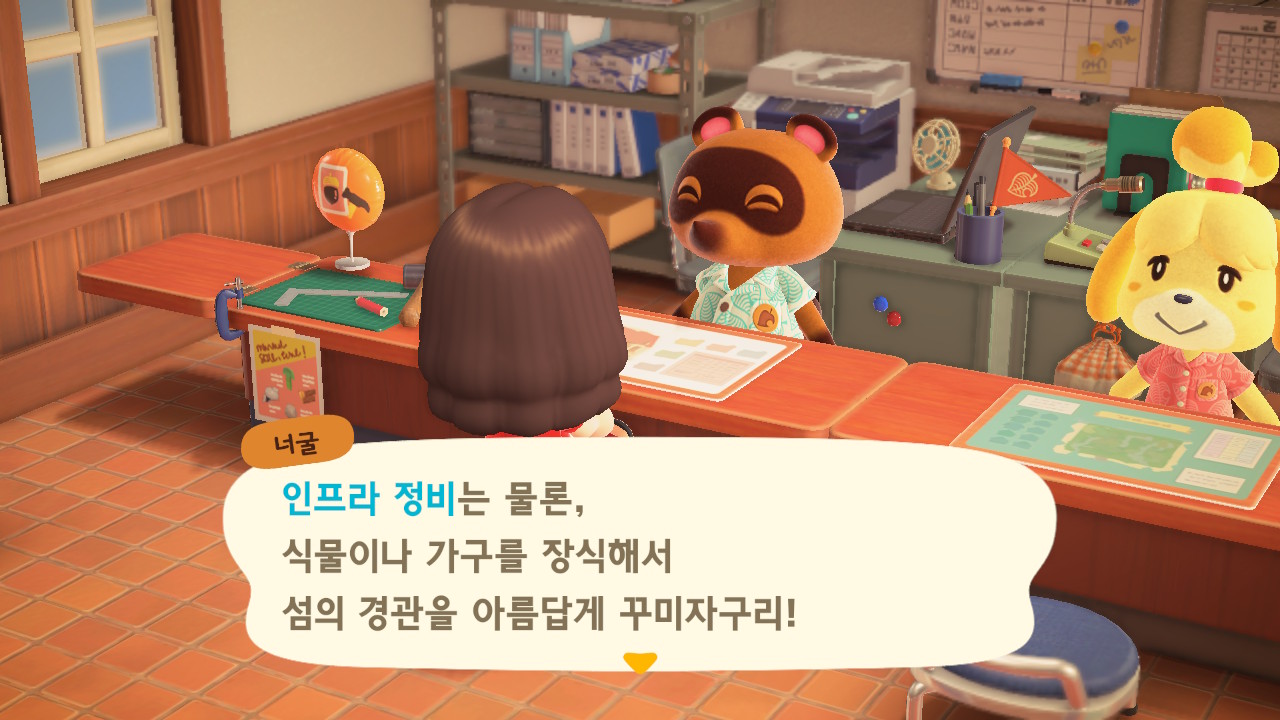 캠핑장 손님이 이주한 이후에 너굴이와 여울이가 섬의 평판에 대해 설명해줍니다. 현재 섬의 평판은 별 1개네요. 제일 먼저 해야 할 일은 주민 수 늘리기입니다. 현재까지 초기 주민 2명, 추가로 집을 지어서 이주한 주민 3명, 캠핑장 이주자 1명 총 6명인 상태입니다. 너굴이가 아미보 카드를 이용해 캠핑장에 손님을 초대할 수 있다고 알려주네요. 아미보 카드가 없어도 가끔 캠핑장에 손님이 찾아오니 걱정하지 않아도 돼요. 그리고 마일 섬에서도 주민을 데려올 수 있어요.
