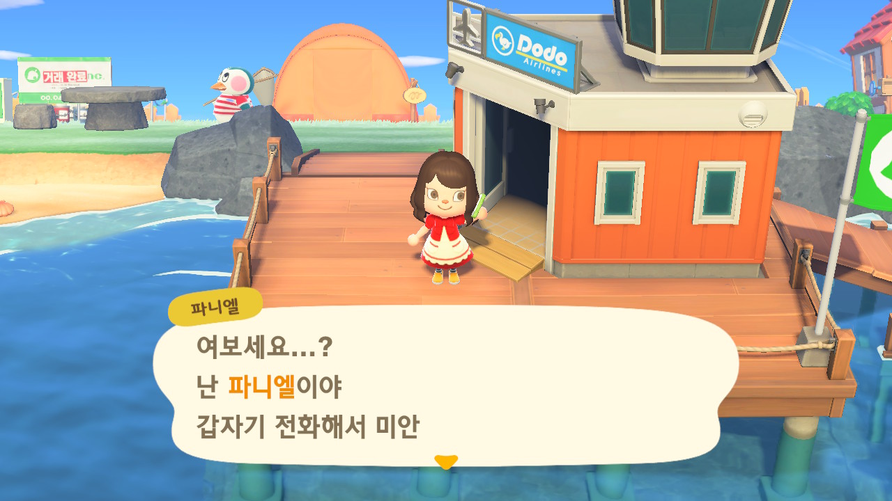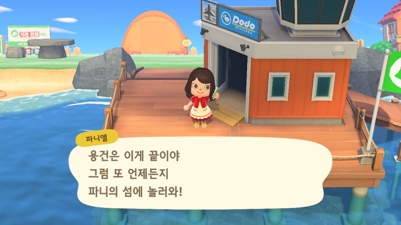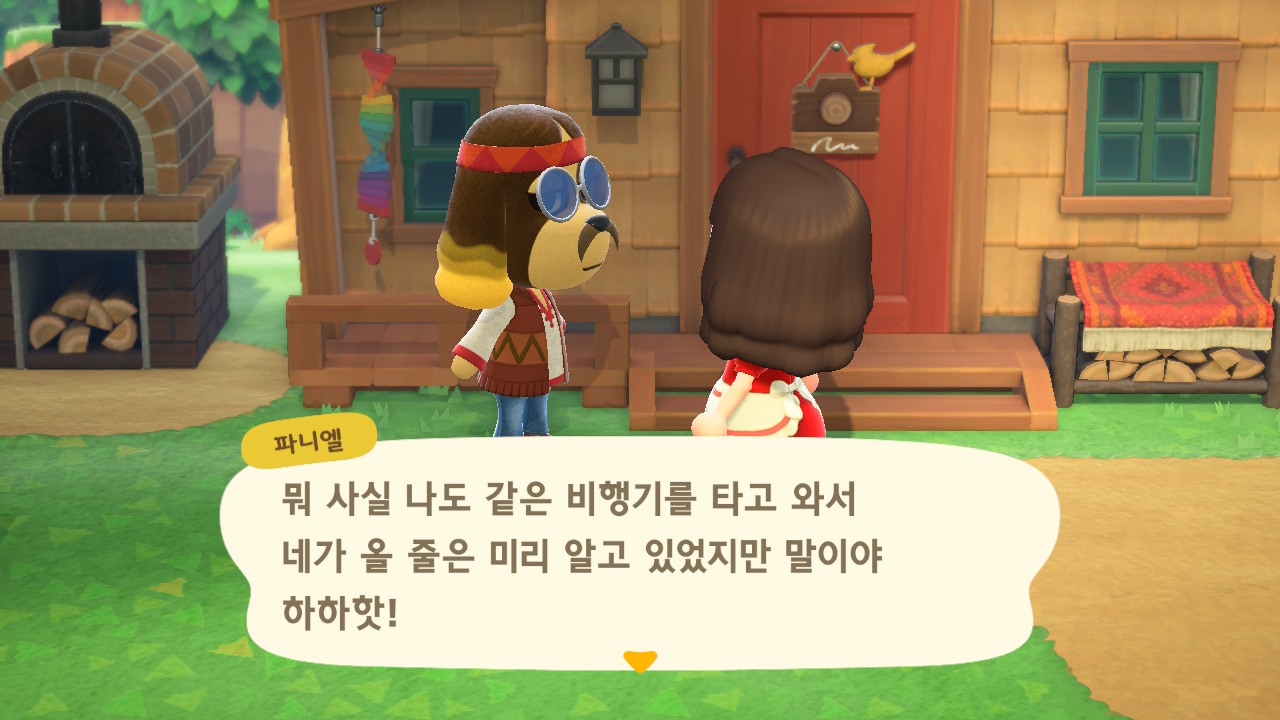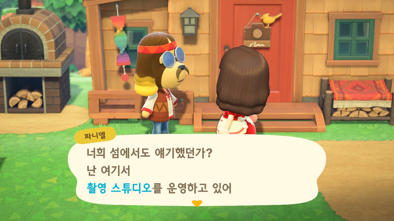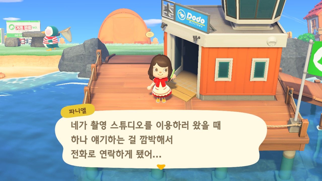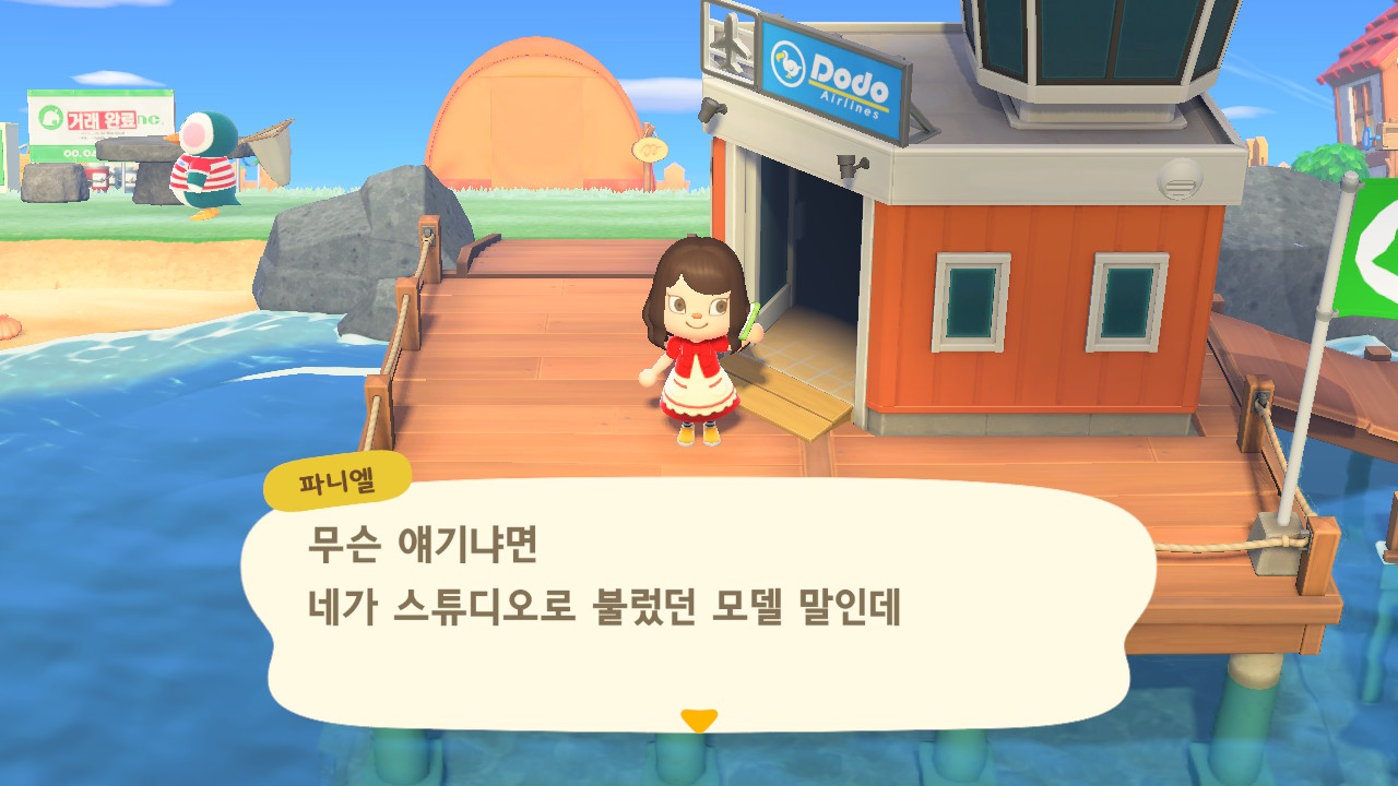 3일차에 파니엘이 나타났어요. 비행장에서 파니의 섬에 가고 싶다고 하면 갈 수 있고, 촬영 스튜디오를 꾸밀 수 있습니다. 초기 주민인 김말이 미랑이와 기념 사진을 찍어봤어요. 사진을 찍고 섬으로 돌아오면 너굴포트에서 해당 주민의 포스터를 구입할 수 있어요.