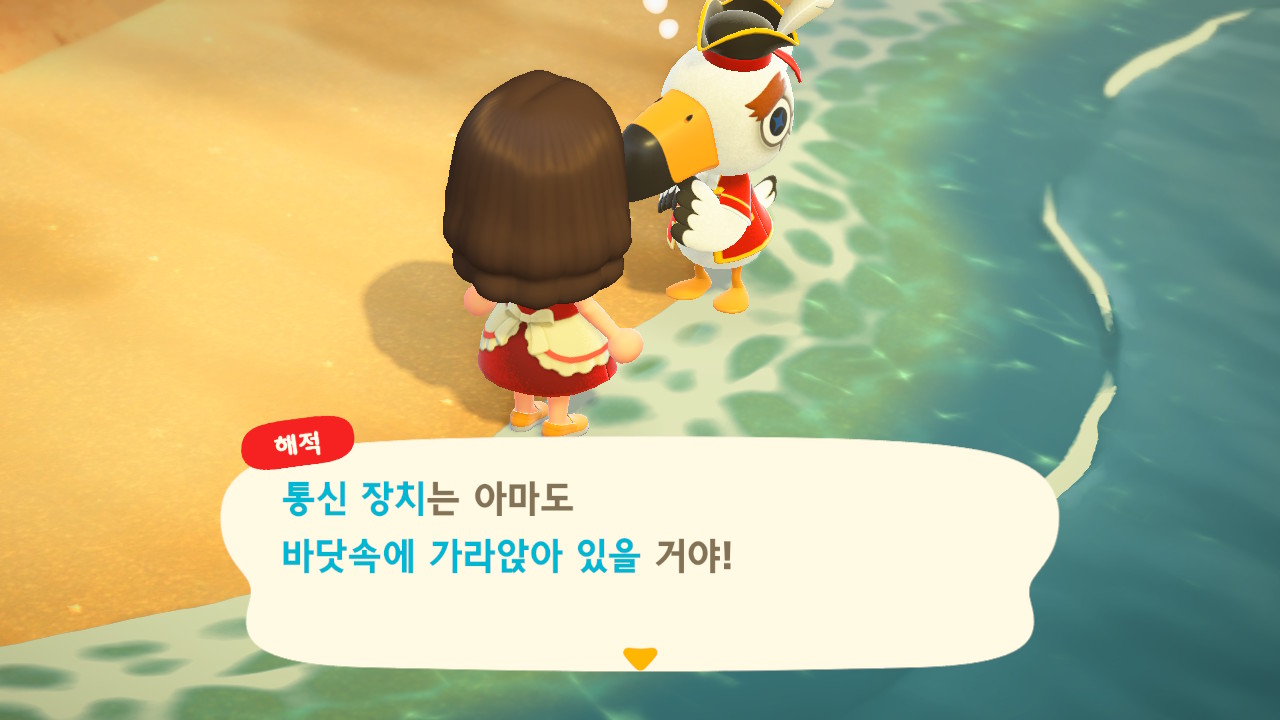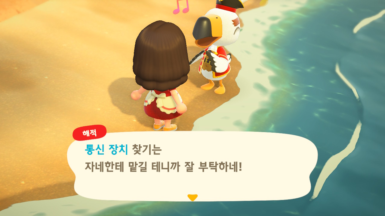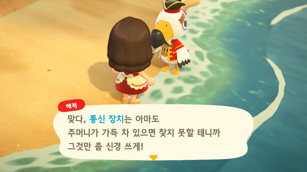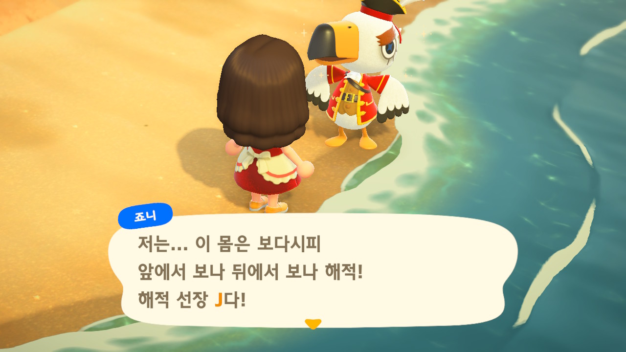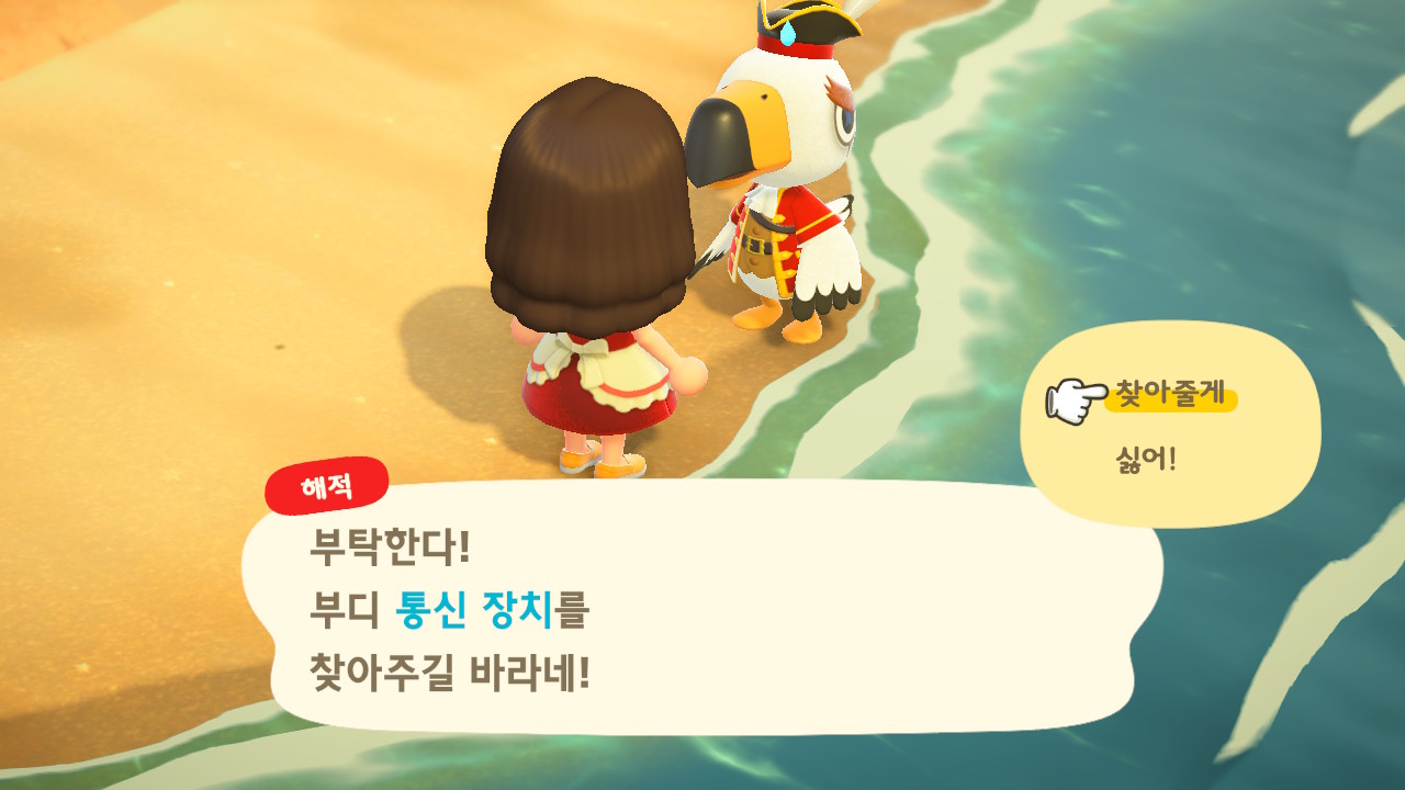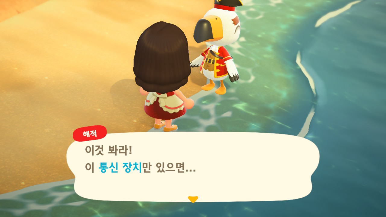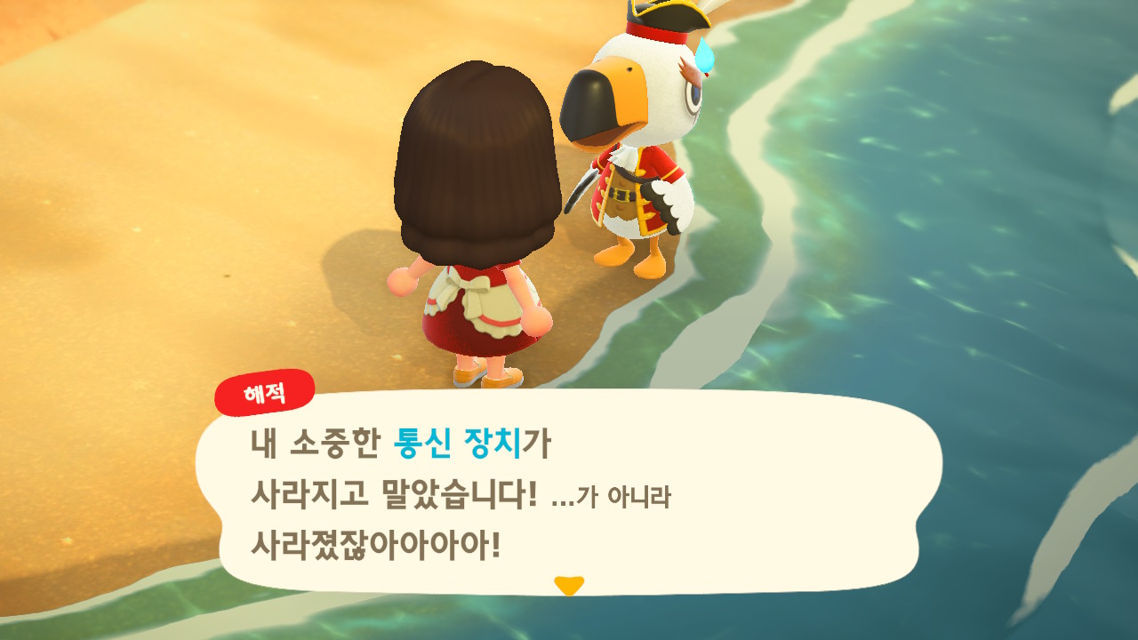 죠니와 똑같이 생겼지만 해적 옷을 입은 해적 선장 J 가 왔어요. 대화할 때 처음에는 죠니라고 표시되다가 해적으로 바뀌네요. 죠니와 해적의 차이점은 죠니의 통신장치는 바지락을 캘 때처럼 삽으로 모래사장을 파야 구할 수 있고, 해적의 통신장치는 수영복을 입고 바다에 들어가 해산물 구할 때처럼 구해야 해요.