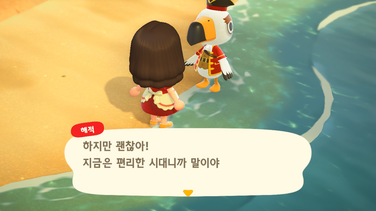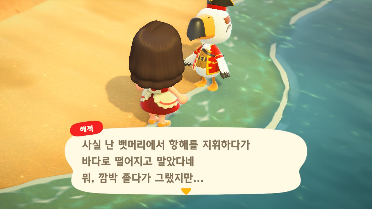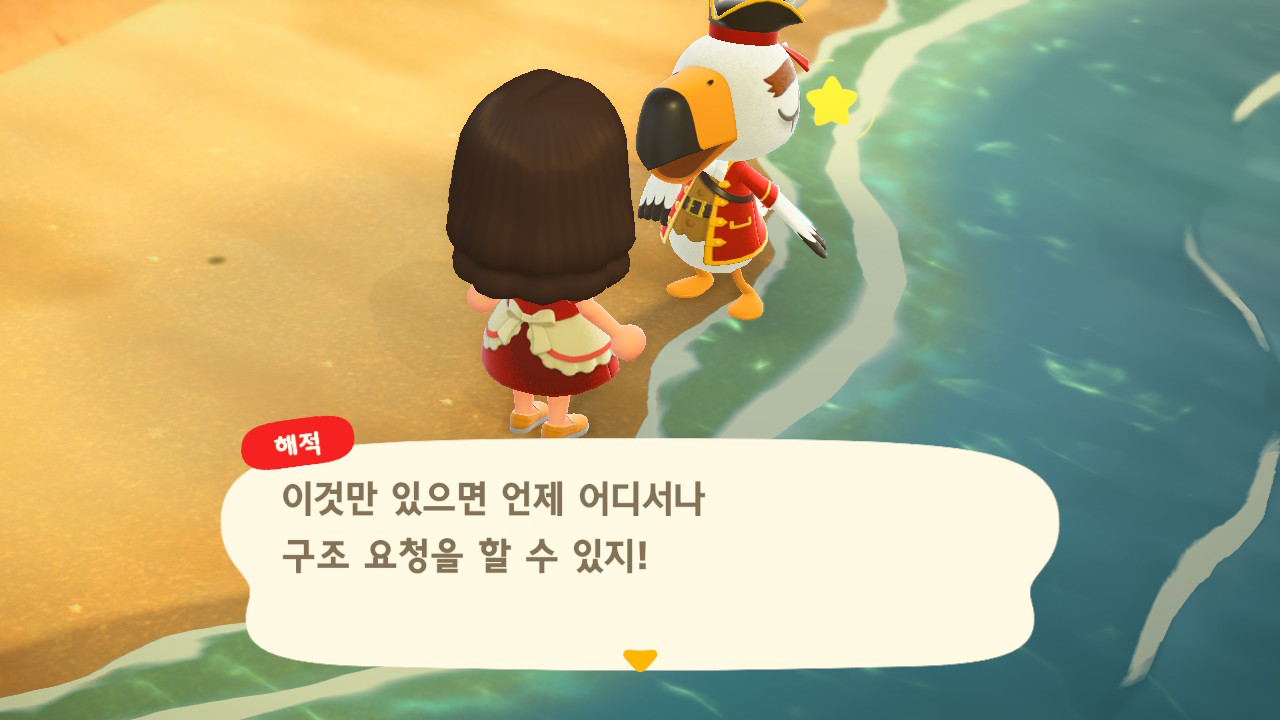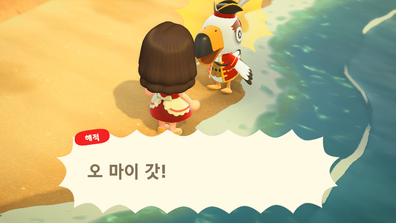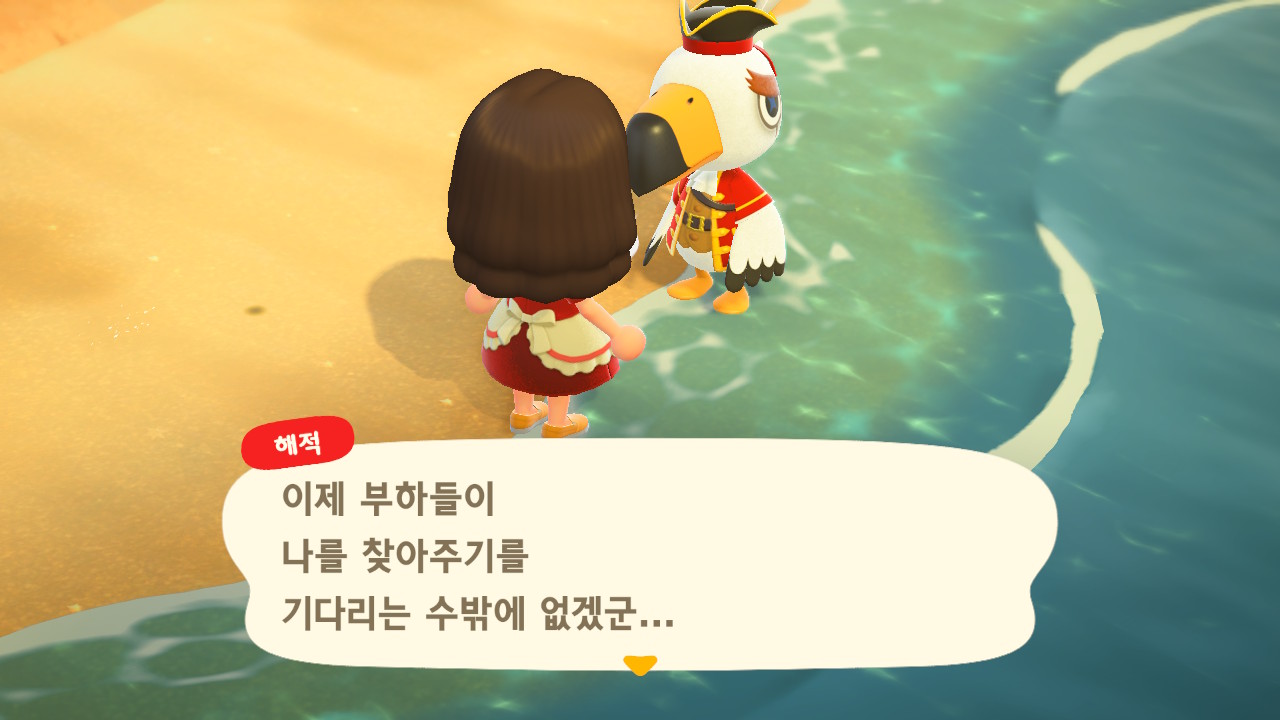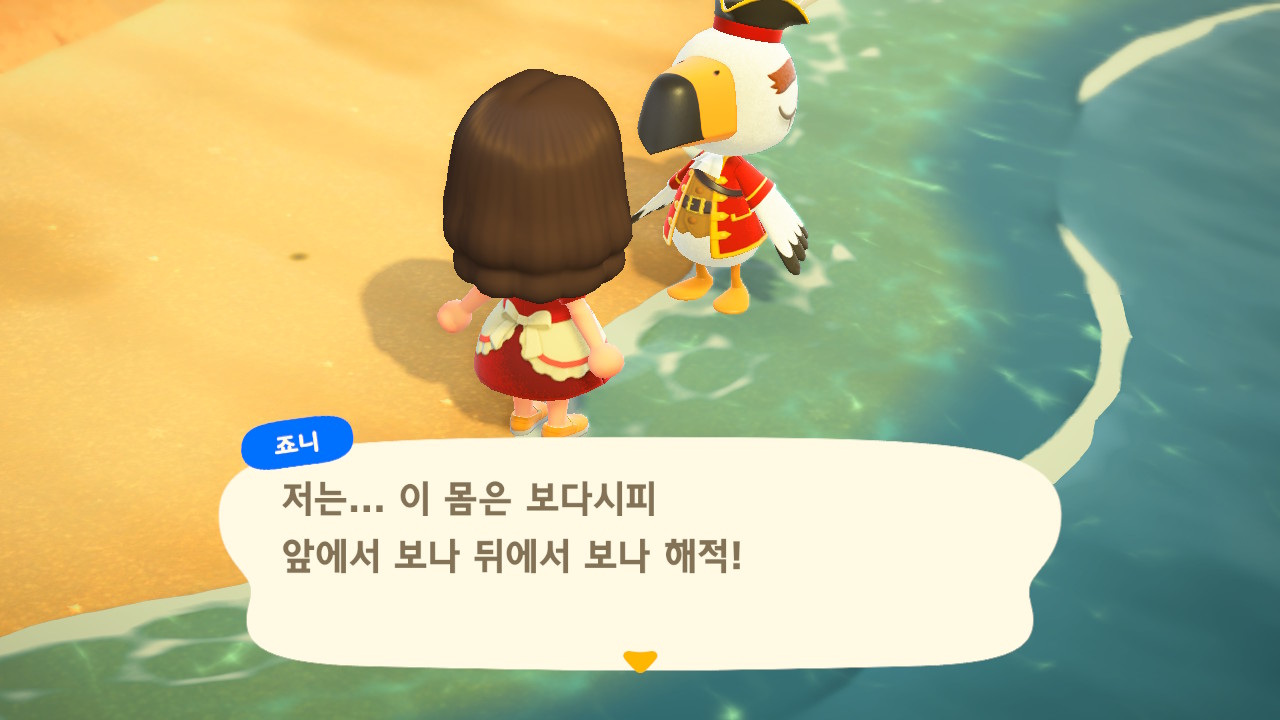 죠니와 똑같이 생겼지만 해적 옷을 입은 해적 선장 J 가 왔어요. 대화할 때 처음에는 죠니라고 표시되다가 해적으로 바뀌네요. 죠니와 해적의 차이점은 죠니의 통신장치는 바지락을 캘 때처럼 삽으로 모래사장을 파야 구할 수 있고, 해적의 통신장치는 수영복을 입고 바다에 들어가 해산물 구할 때처럼 구해야 해요.