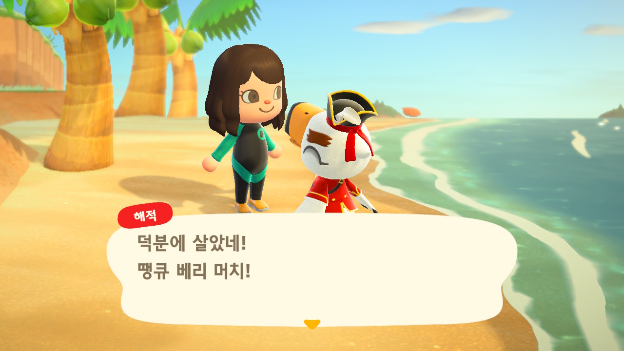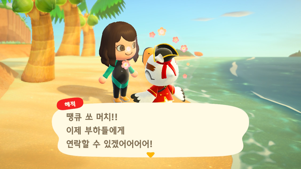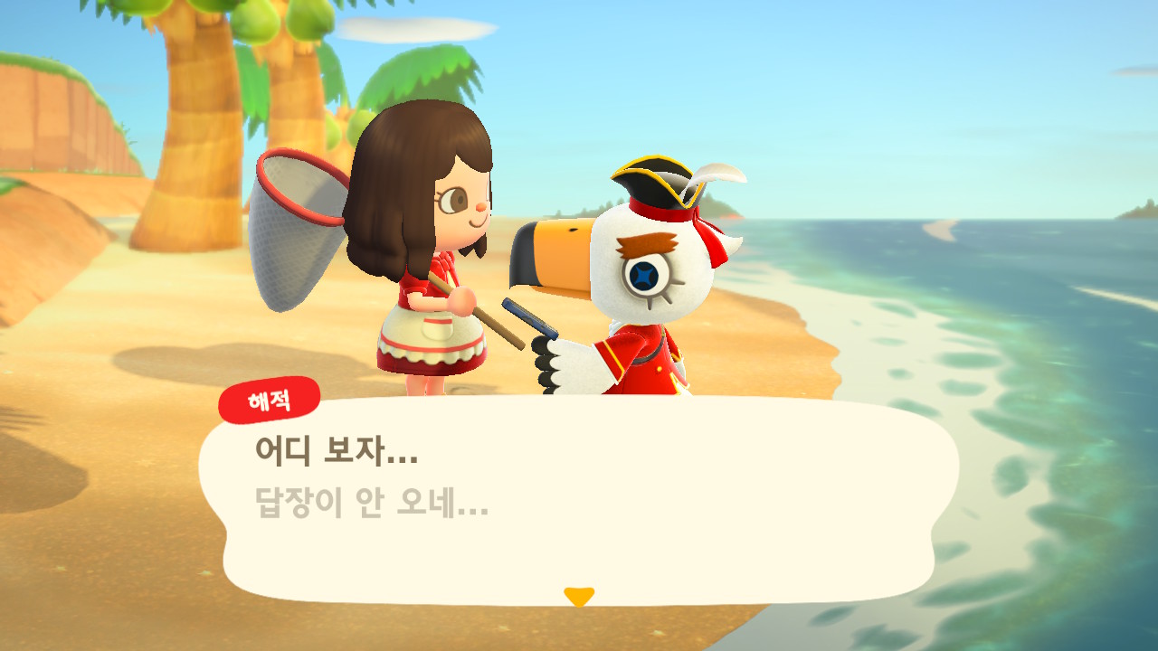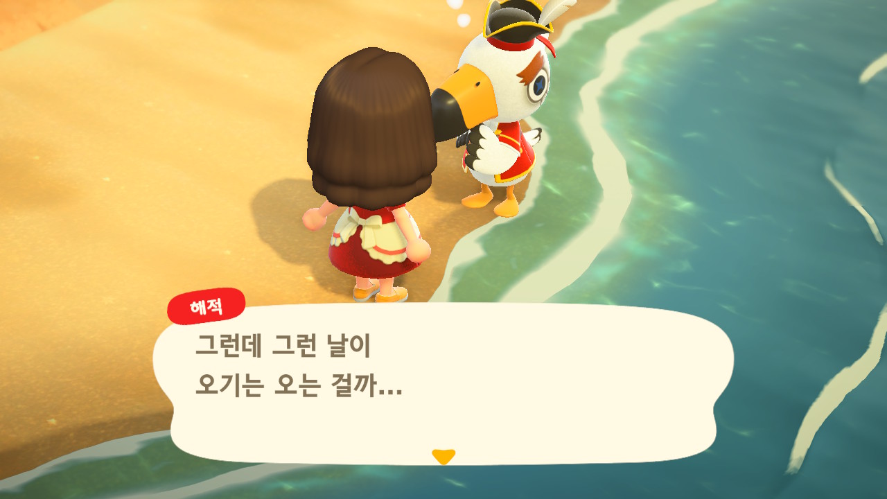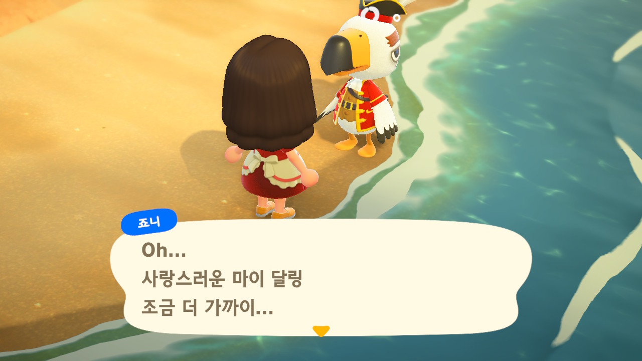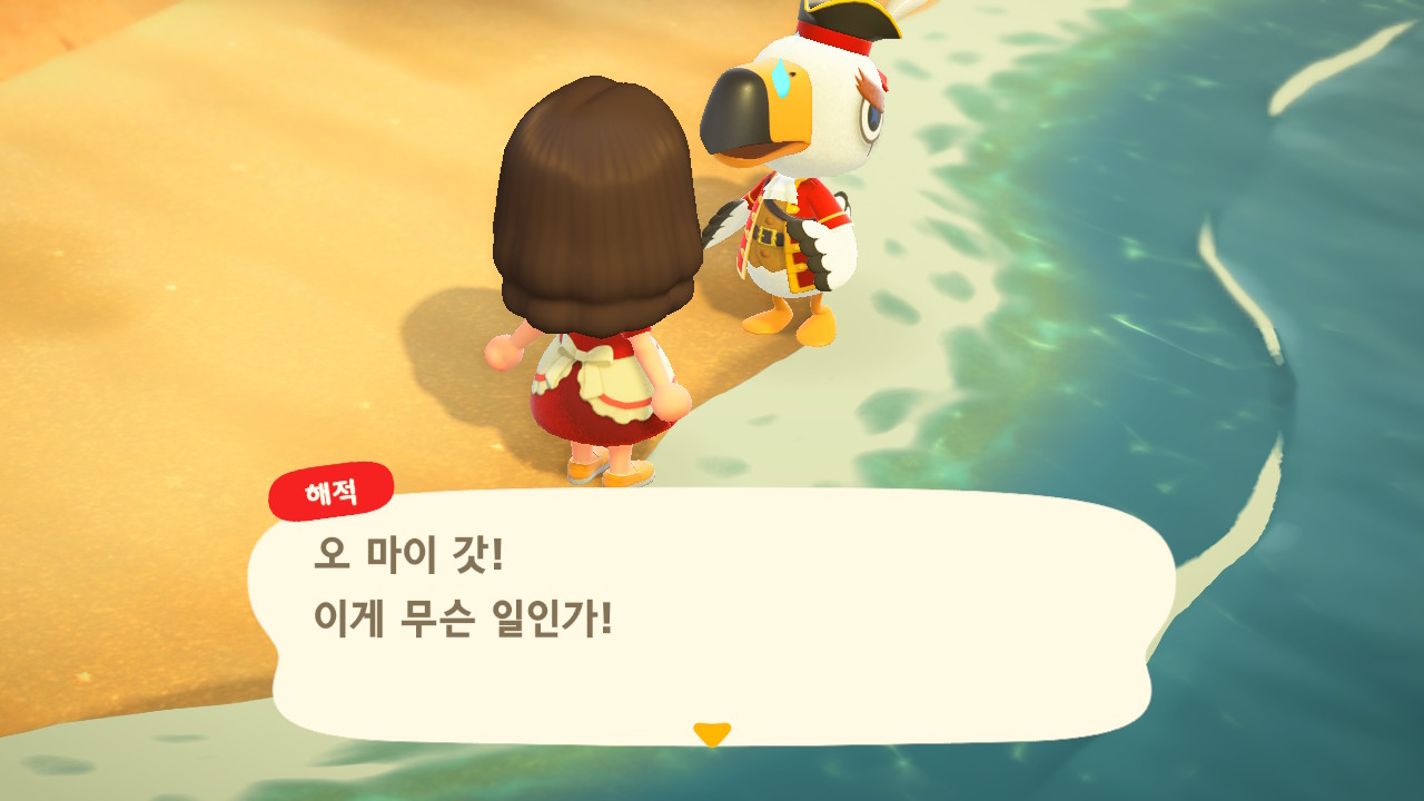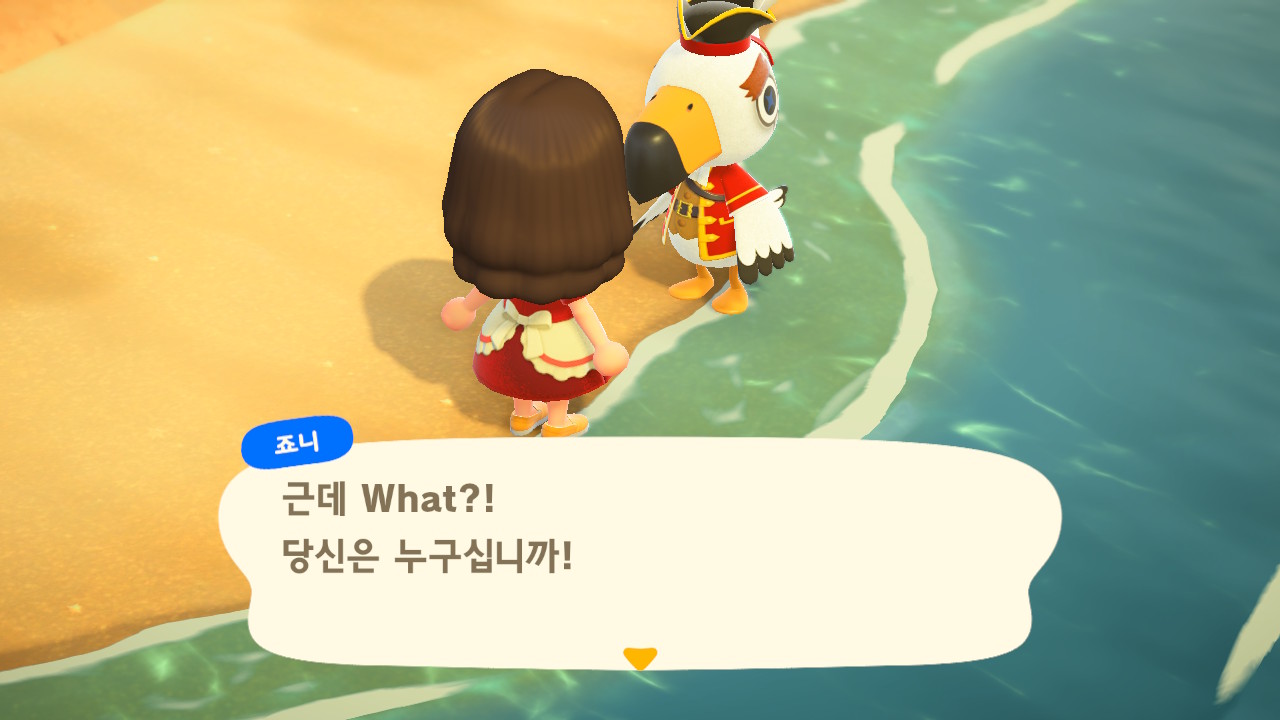 죠니와 똑같이 생겼지만 해적 옷을 입은 해적 선장 J 가 왔어요. 대화할 때 처음에는 죠니라고 표시되다가 해적으로 바뀌네요. 죠니와 해적의 차이점은 죠니의 통신장치는 바지락을 캘 때처럼 삽으로 모래사장을 파야 구할 수 있고, 해적의 통신장치는 수영복을 입고 바다에 들어가 해산물 구할 때처럼 구해야 해요.