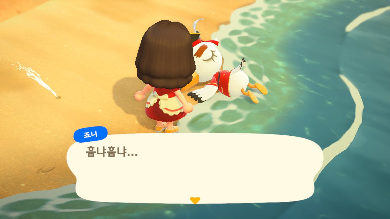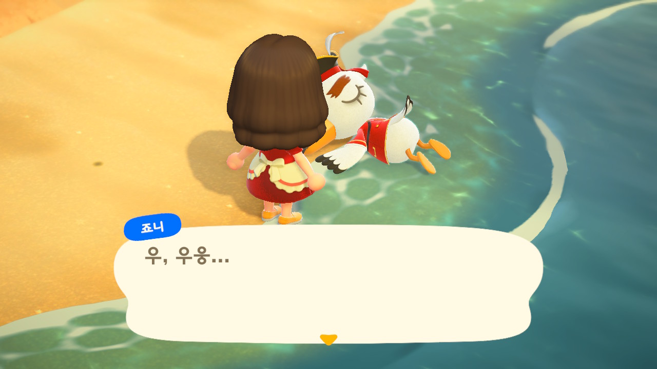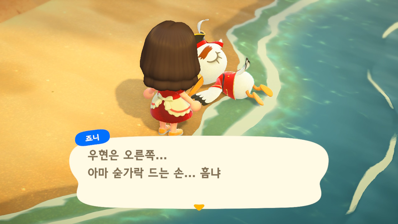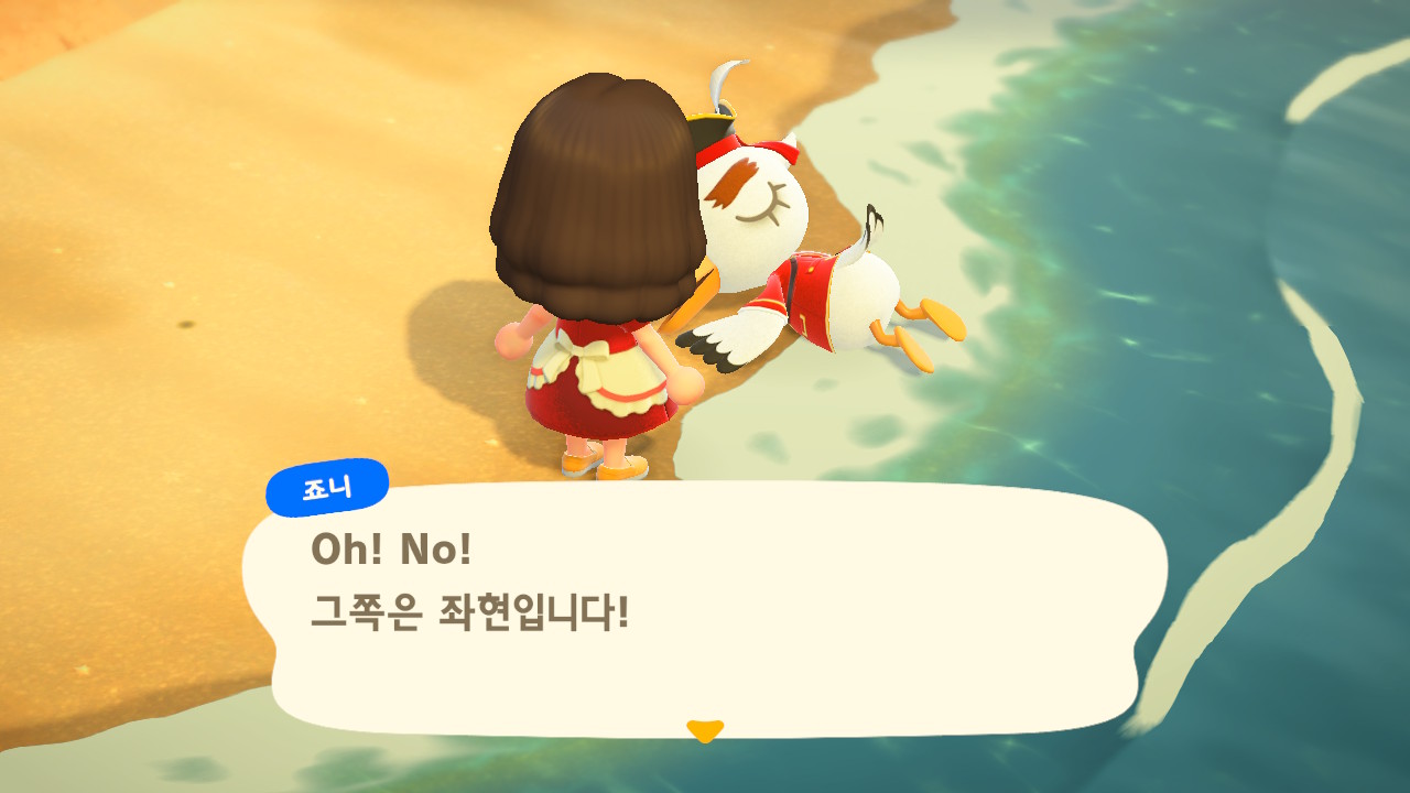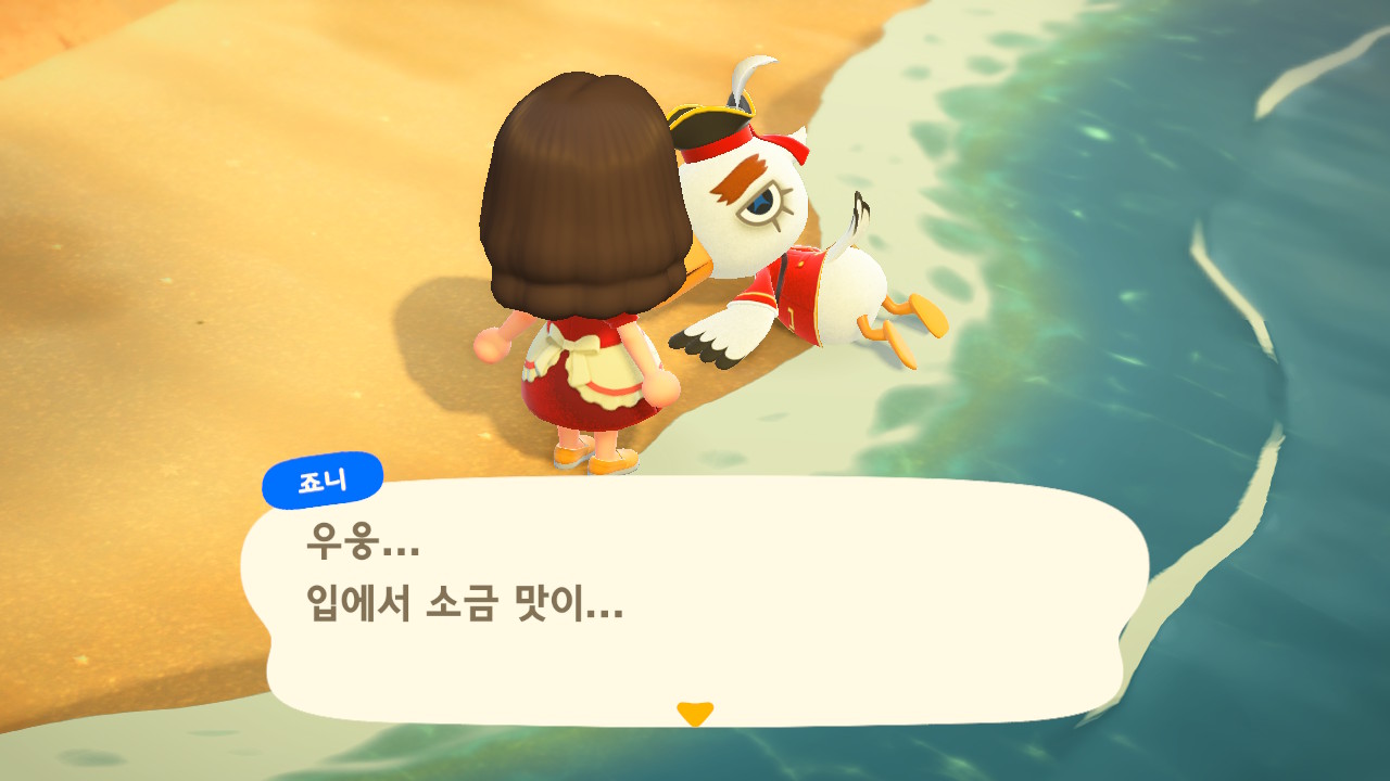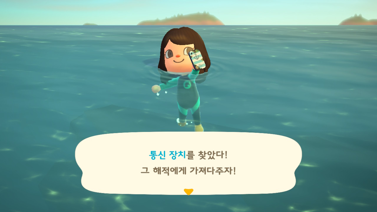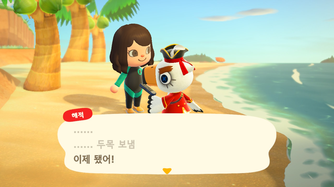 죠니와 똑같이 생겼지만 해적 옷을 입은 해적 선장 J 가 왔어요. 대화할 때 처음에는 죠니라고 표시되다가 해적으로 바뀌네요. 죠니와 해적의 차이점은 죠니의 통신장치는 바지락을 캘 때처럼 삽으로 모래사장을 파야 구할 수 있고, 해적의 통신장치는 수영복을 입고 바다에 들어가 해산물 구할 때처럼 구해야 해요.