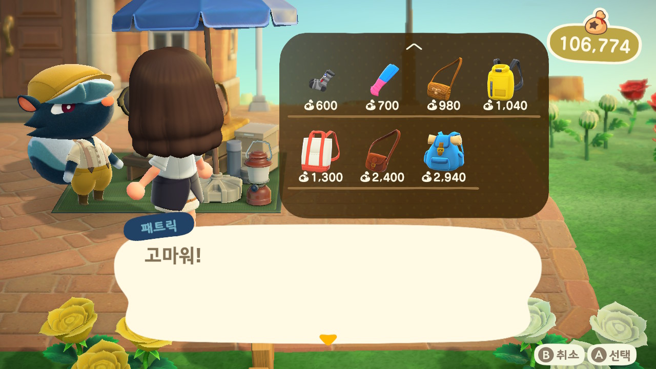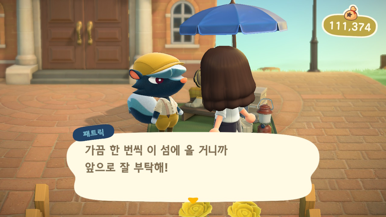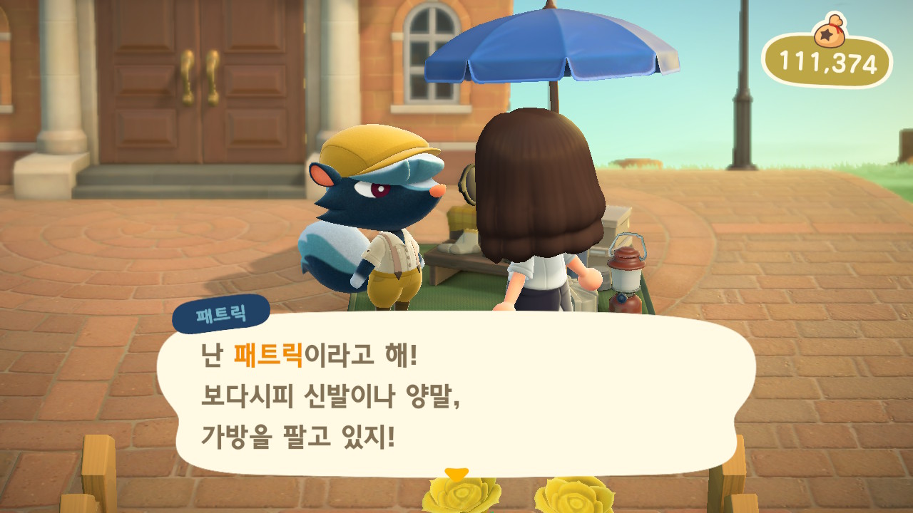 광장에 패트릭이 와있었어요. 패트릭은 에이블시스터즈에서는 팔지 않는 신발, 양말, 가방을 팔아요.