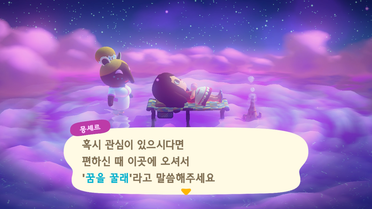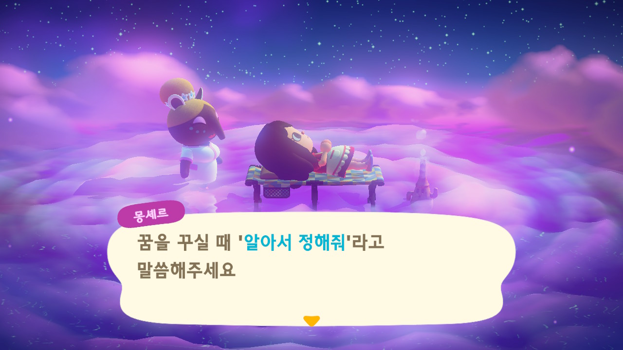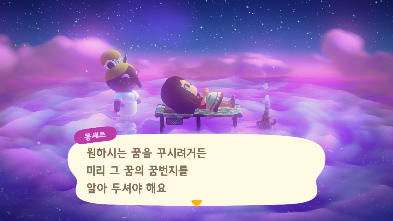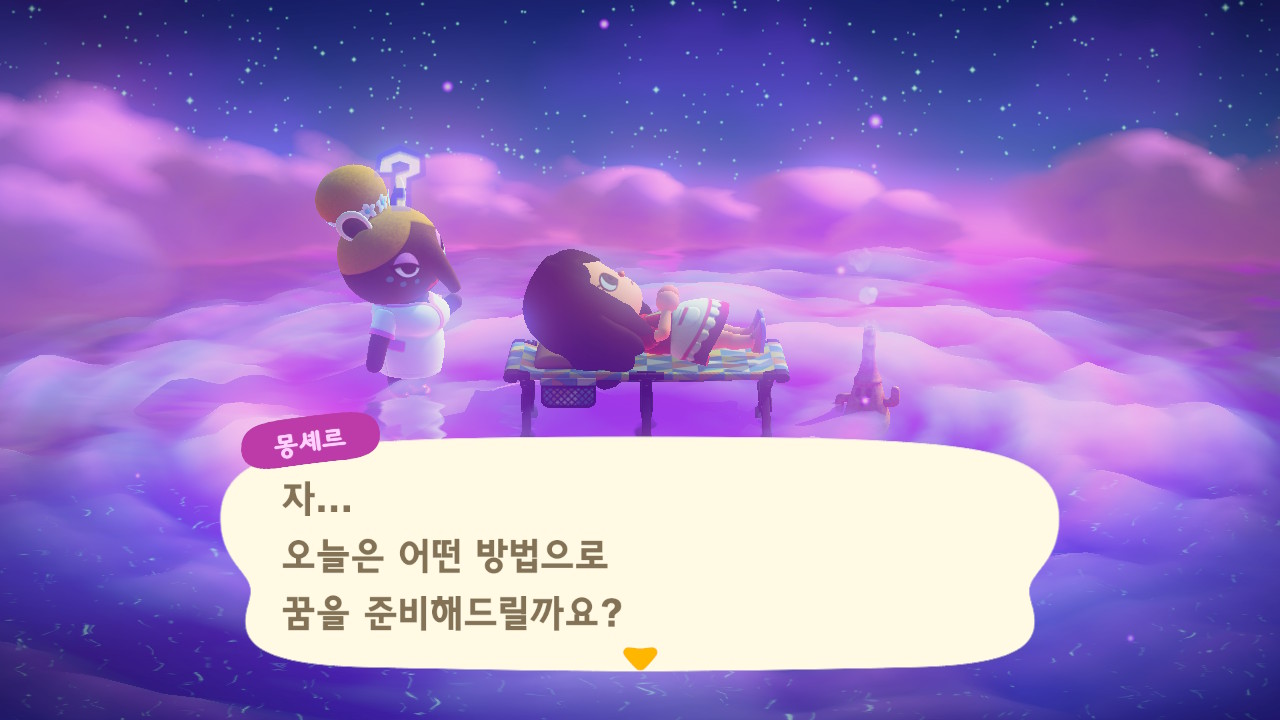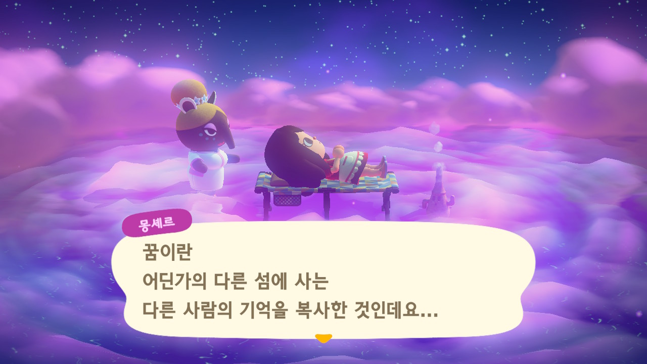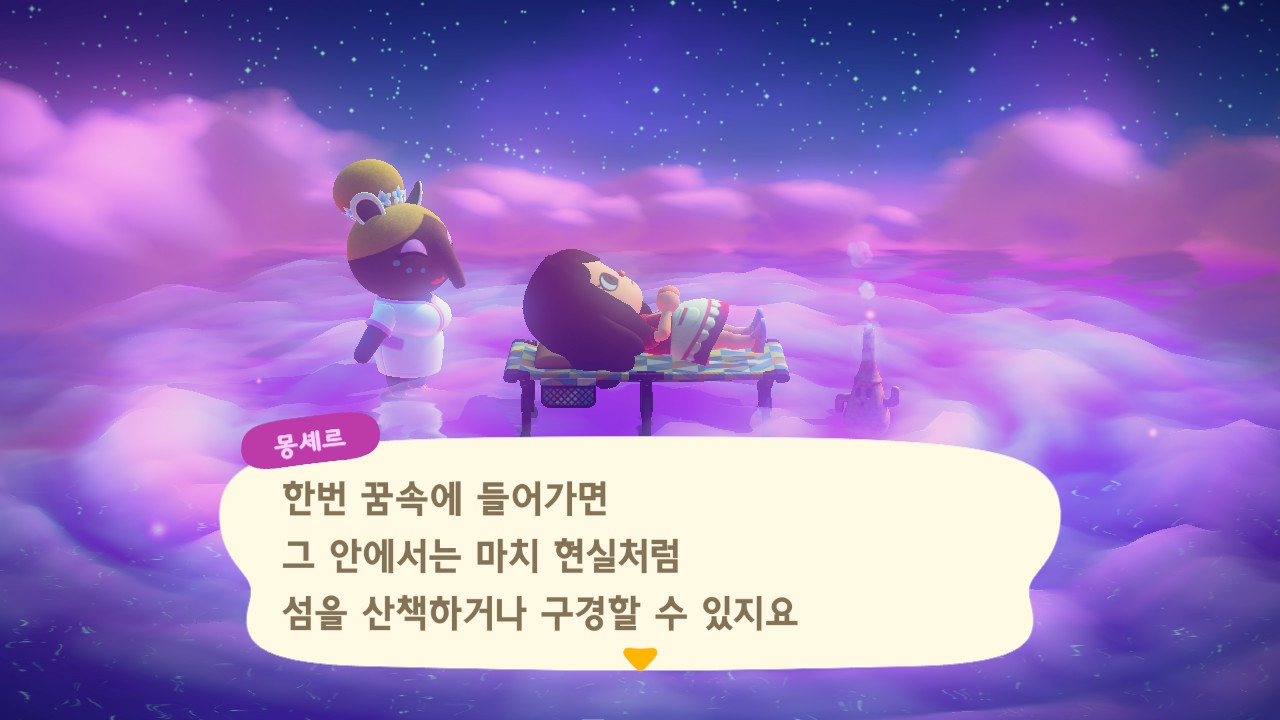 3일 차에 몽셰르에게 편지가 왔어요. 선물로 침대가 들어있고, 침대에 누우면 꿈을 꿀 수 있어요. 꼭 몽셰르가 준 침대가 아니더라도 침대에 누우면 꿈을 꿀 수 있습니다. 꿈을 맡기면 현재 상태의 섬이 저장되고 꿈 번지를 이용해 다른 사람이 구경할 수 있어요. 섬 꾸미기 할 때 다른 사람의 섬을 꿈으로 방문해서 구경하고 참고하면 도움이 많이 될 것 같아요.
