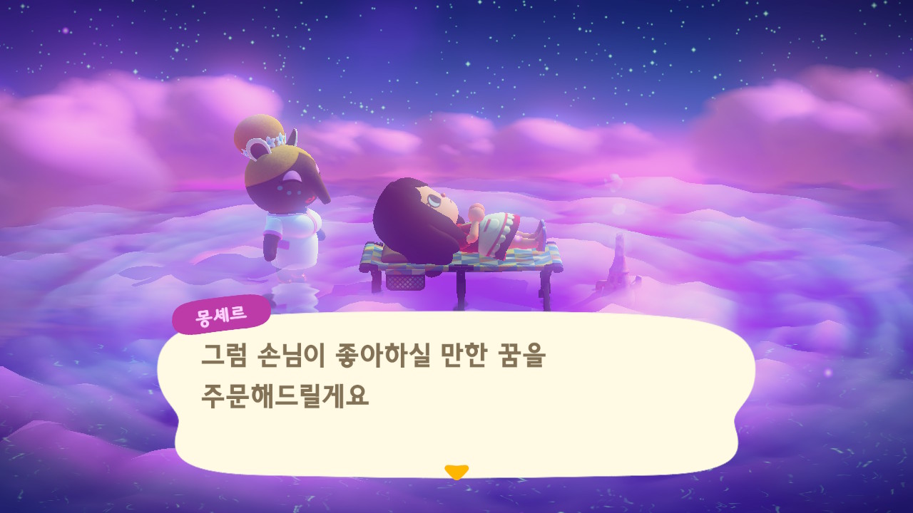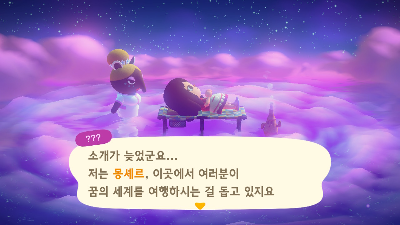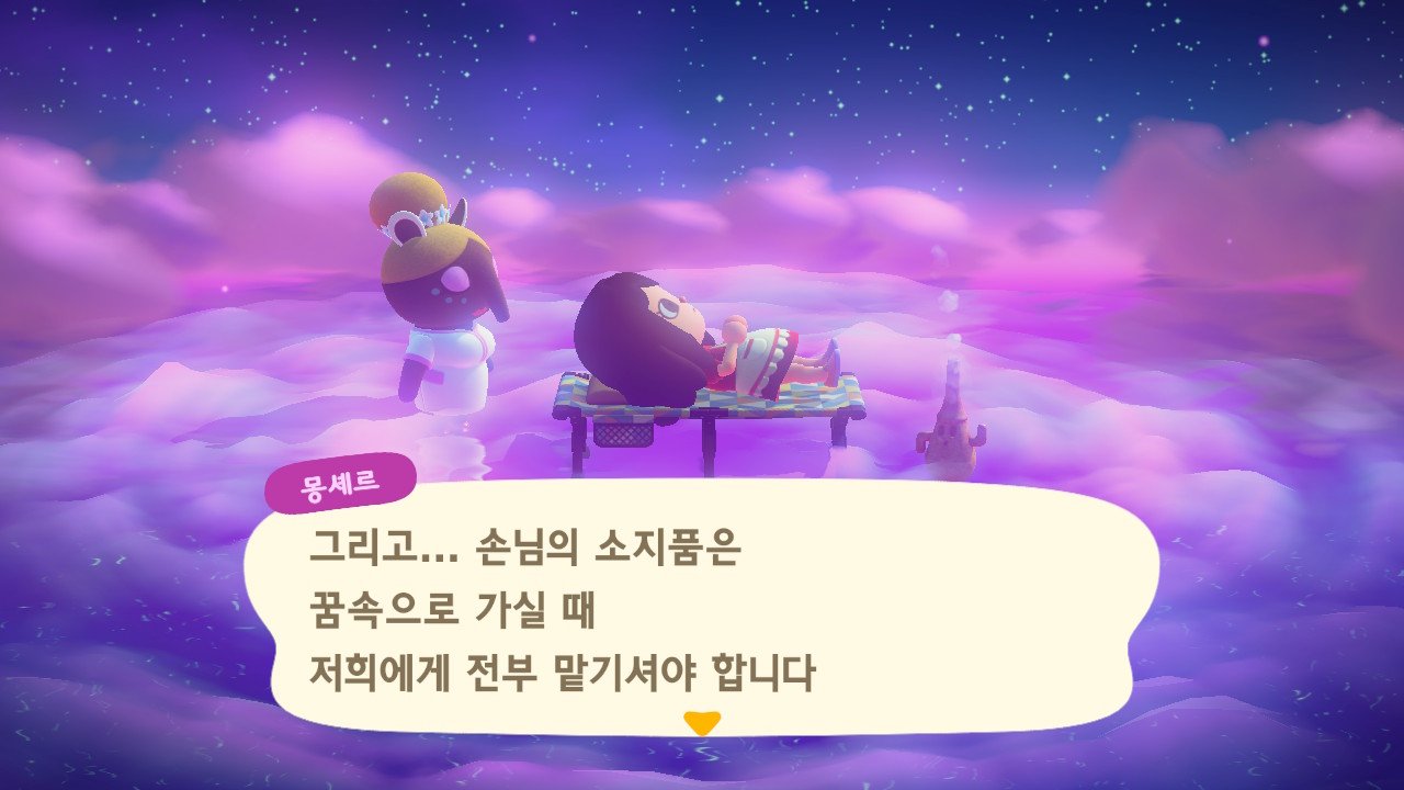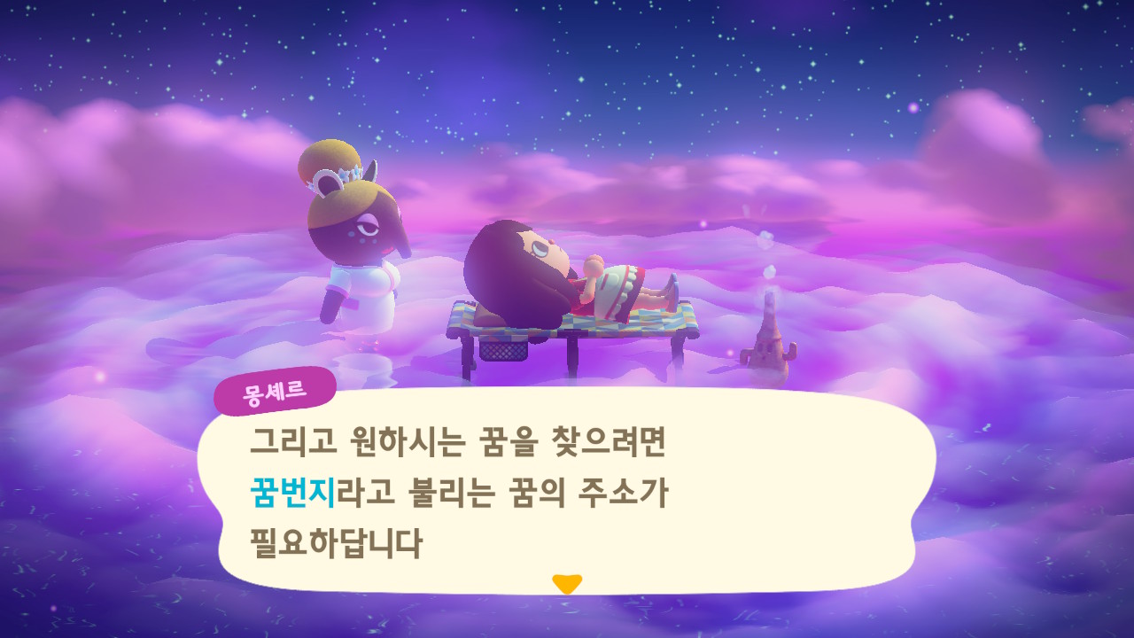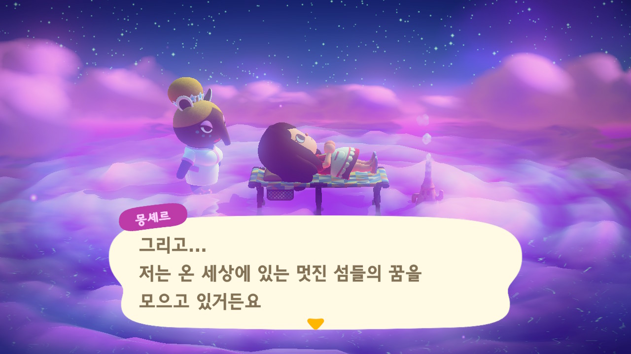 3일 차에 몽셰르에게 편지가 왔어요. 선물로 침대가 들어있고, 침대에 누우면 꿈을 꿀 수 있어요. 꼭 몽셰르가 준 침대가 아니더라도 침대에 누우면 꿈을 꿀 수 있습니다. 꿈을 맡기면 현재 상태의 섬이 저장되고 꿈 번지를 이용해 다른 사람이 구경할 수 있어요. 섬 꾸미기 할 때 다른 사람의 섬을 꿈으로 방문해서 구경하고 참고하면 도움이 많이 될 것 같아요.