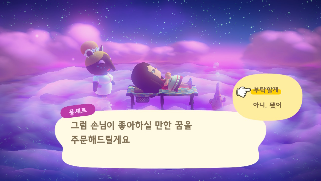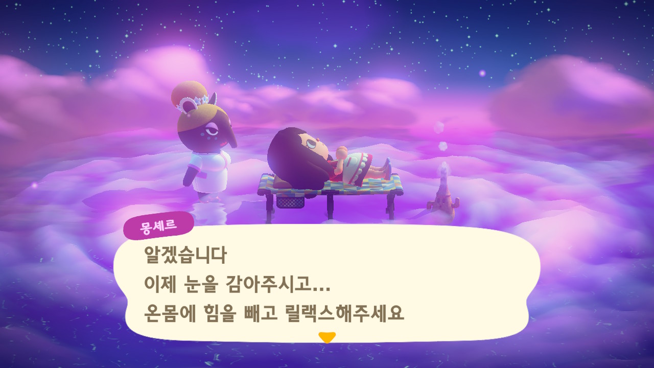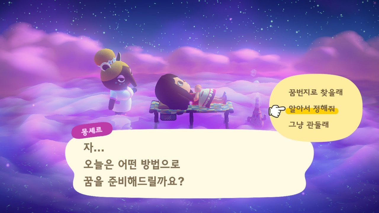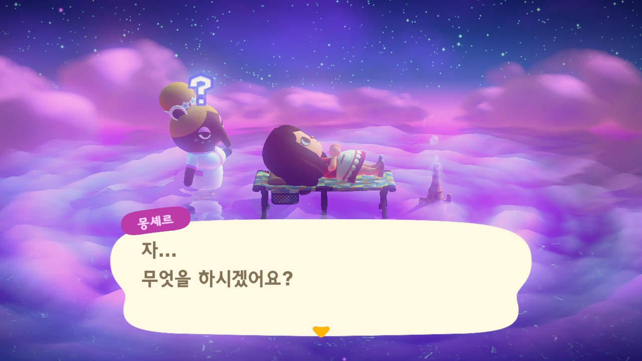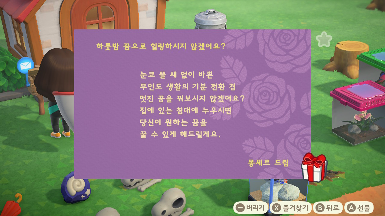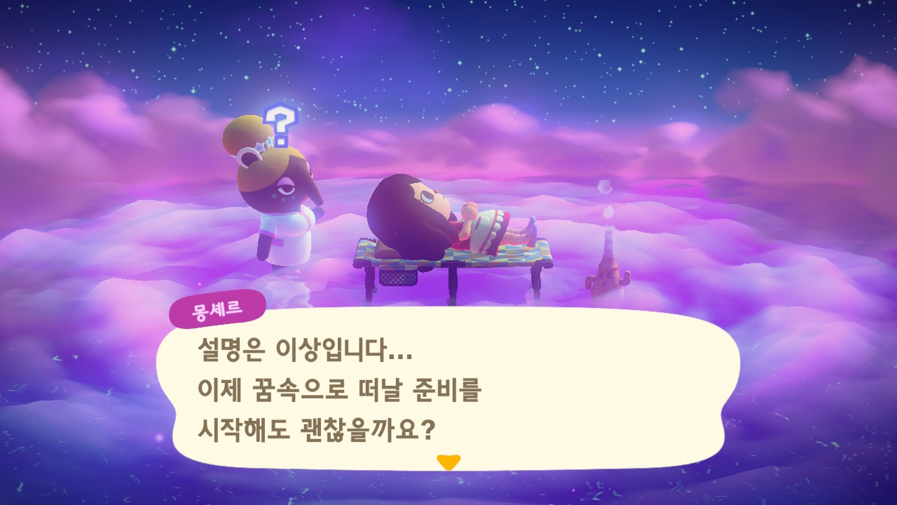 3일 차에 몽셰르에게 편지가 왔어요. 선물로 침대가 들어있고, 침대에 누우면 꿈을 꿀 수 있어요. 꼭 몽셰르가 준 침대가 아니더라도 침대에 누우면 꿈을 꿀 수 있습니다. 꿈을 맡기면 현재 상태의 섬이 저장되고 꿈 번지를 이용해 다른 사람이 구경할 수 있어요. 섬 꾸미기 할 때 다른 사람의 섬을 꿈으로 방문해서 구경하고 참고하면 도움이 많이 될 것 같아요.