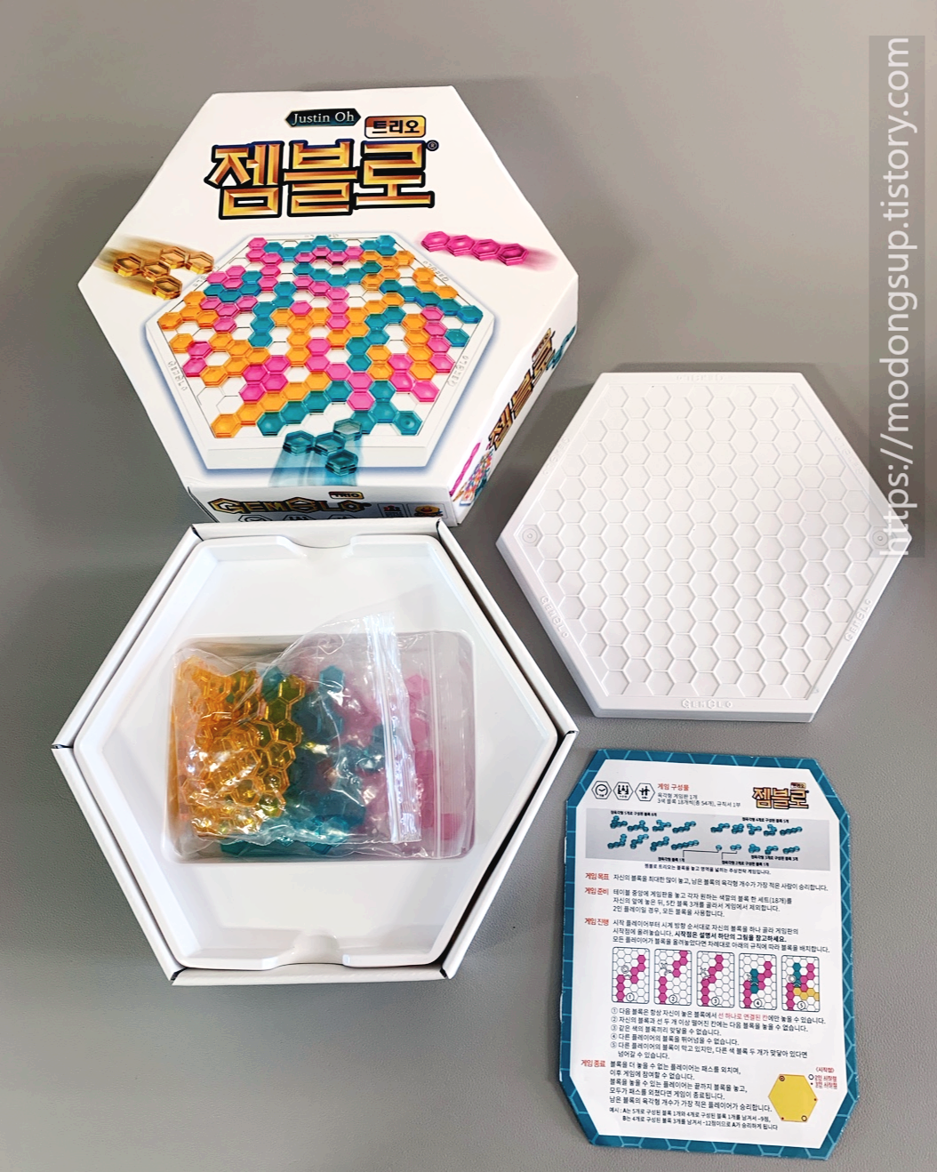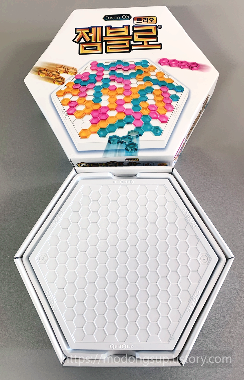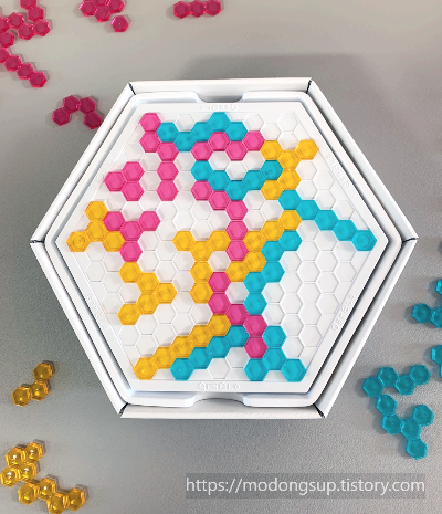 뚜껑을 열면 퍼즐을 올려 게임을 진행할 수 있는 보드가 육각형 보드가 나와요.