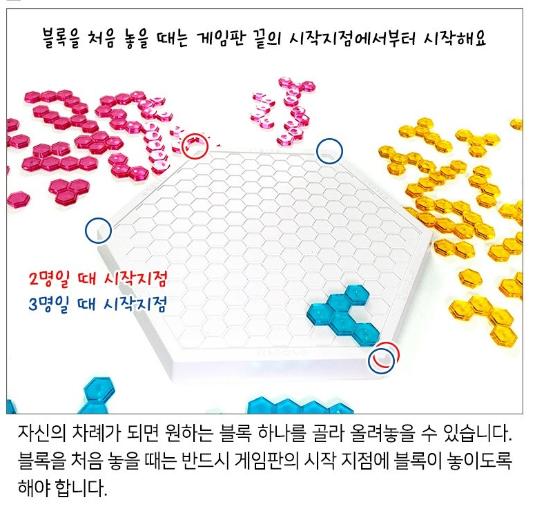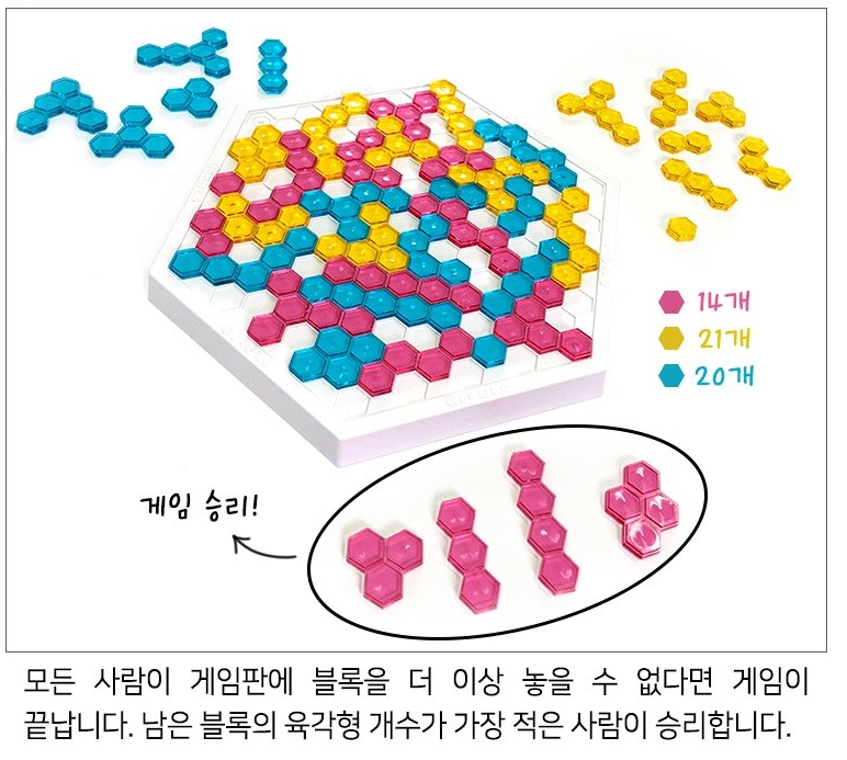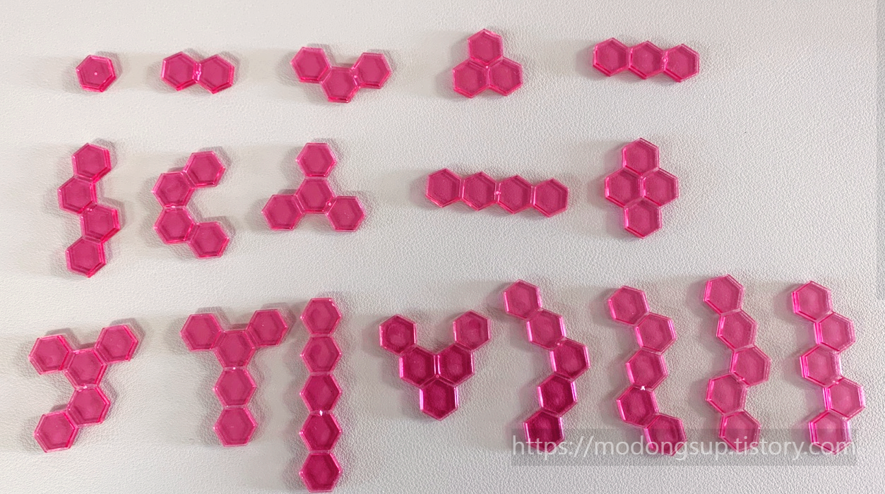 블록은 1~5칸의 육각형 모양으로 이루어졌어요.