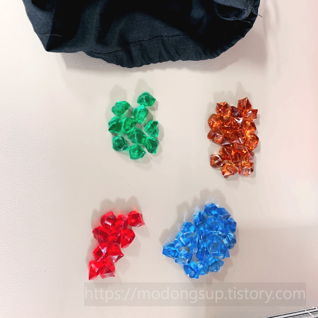 파란색 보석을 하나 가져가고 검은색 주머니에서 보지 않고 랜덤으로 한 개의 보석을 꺼냅니다.