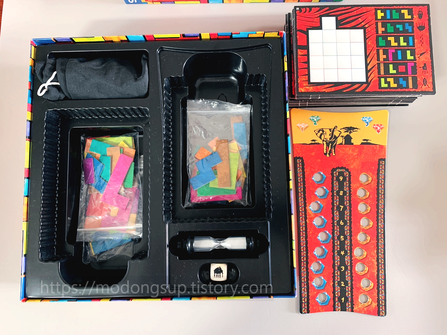 그 아래 공간에는 퍼즐 조각 12개 X 4세트, 모래시계, 동물 모양 주사위가 있어요.