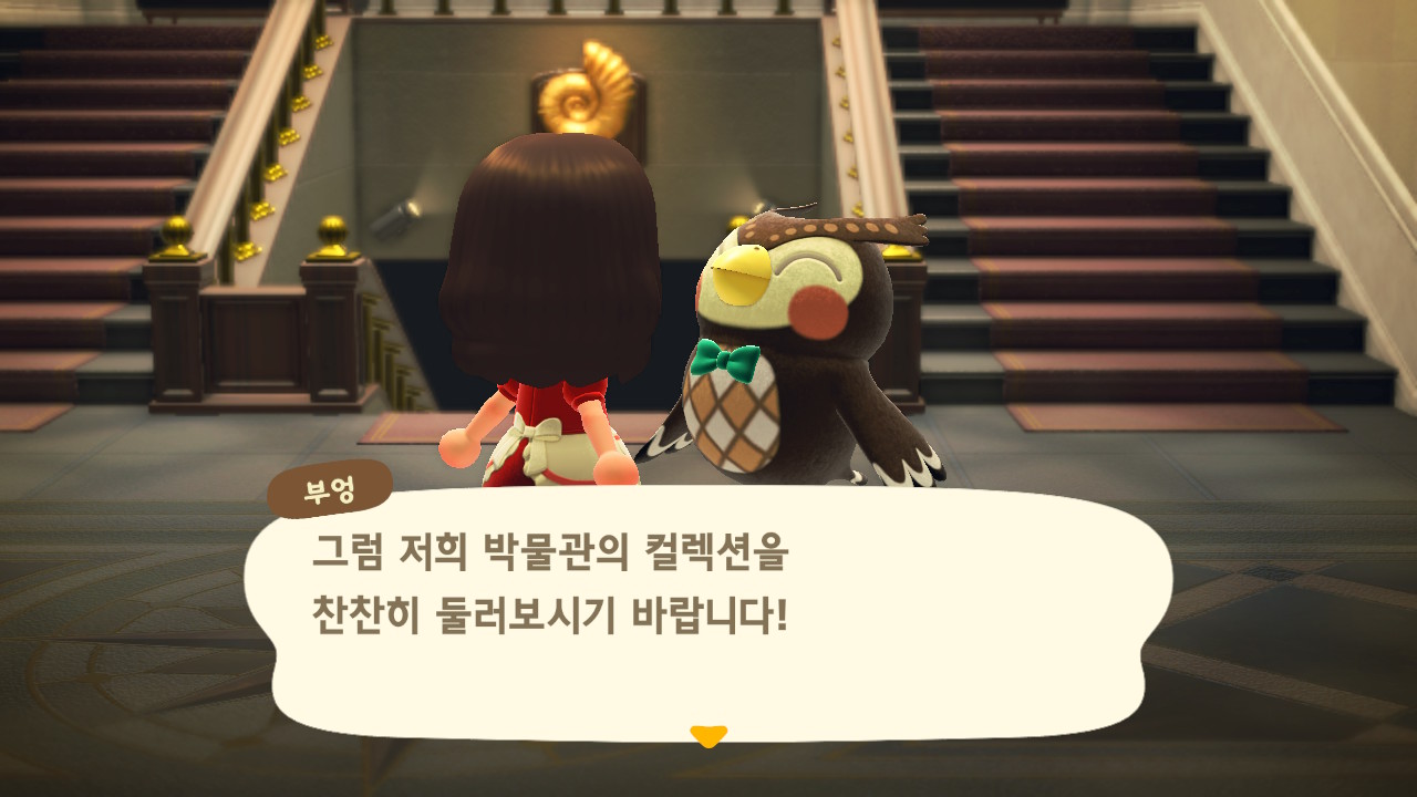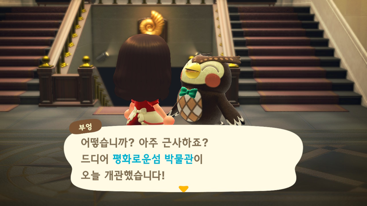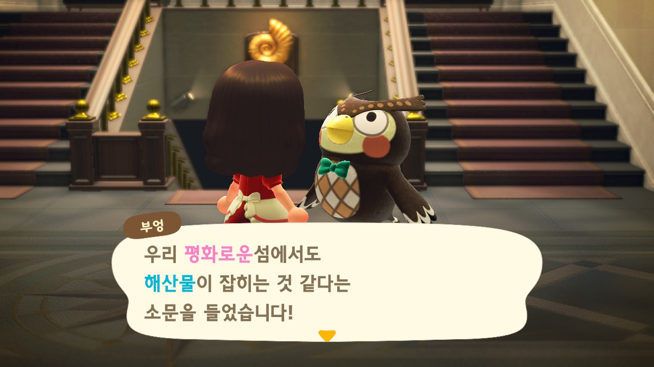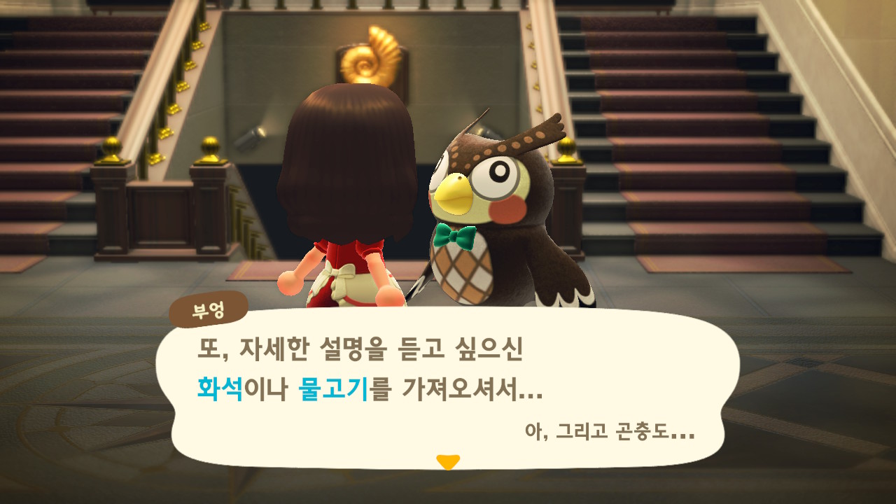 부엉이의 텐트 생활이 끝나고 박물관이 생겼습니다. 박물관에 곤충, 물고기, 화석 전시실이 있습니다. 그리고 해산물도 기증을 받기 시작합니다. 박물관이 생기기 전까지 하나씩만 기증 할 수 있어서 불편했는데 이제 묶음 기증도 가능하네요! 박물관은 24시간 운영되기 때문에 더욱 편리합니다.