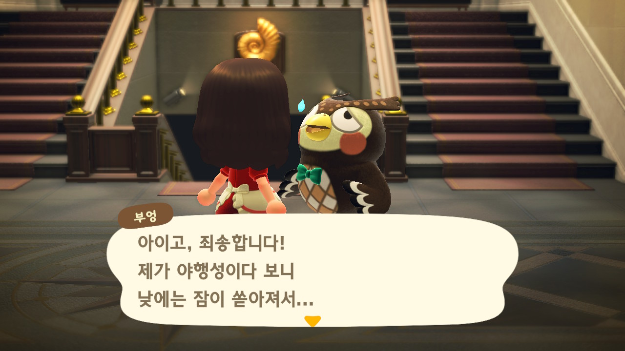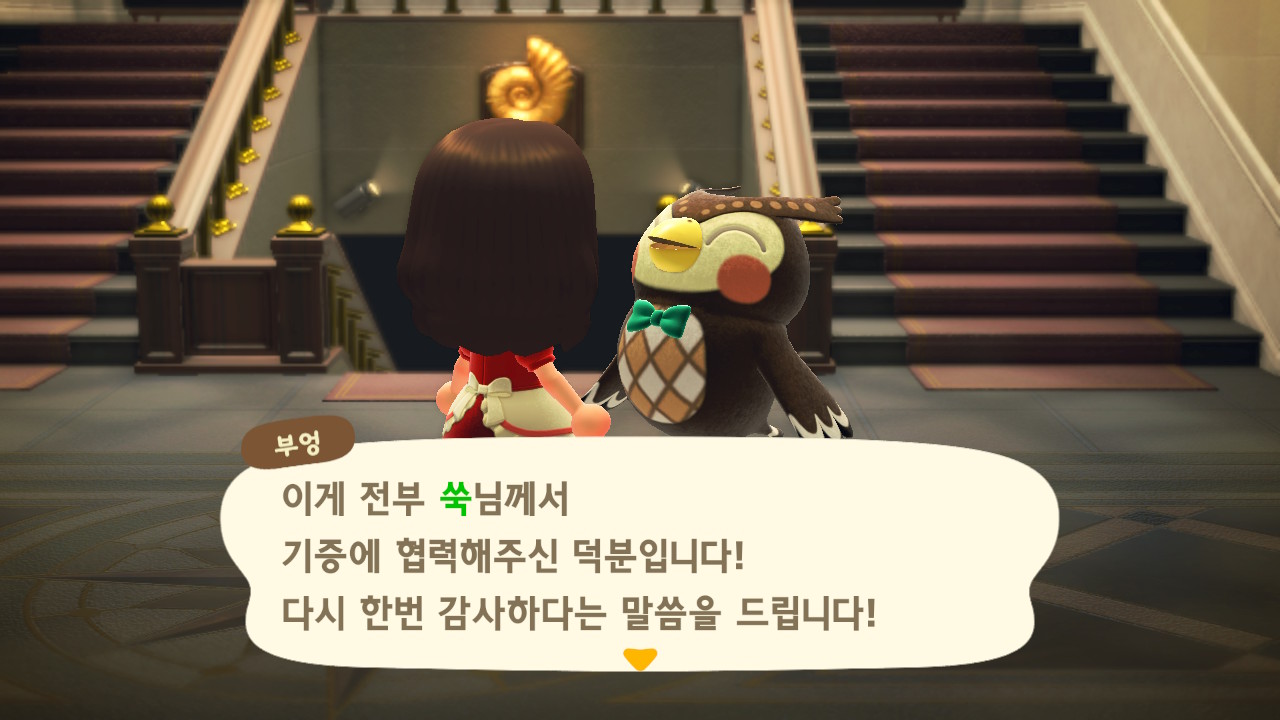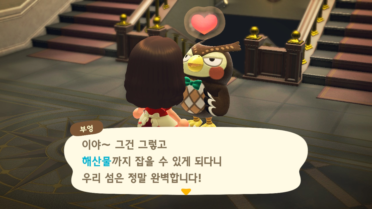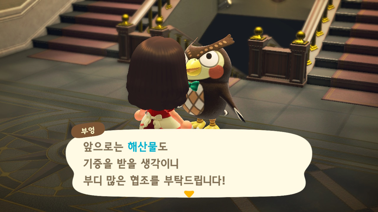 부엉이의 텐트 생활이 끝나고 박물관이 생겼습니다. 박물관에 곤충, 물고기, 화석 전시실이 있습니다. 그리고 해산물도 기증을 받기 시작합니다. 박물관이 생기기 전까지 하나씩만 기증 할 수 있어서 불편했는데 이제 묶음 기증도 가능하네요! 박물관은 24시간 운영되기 때문에 더욱 편리합니다.